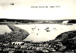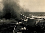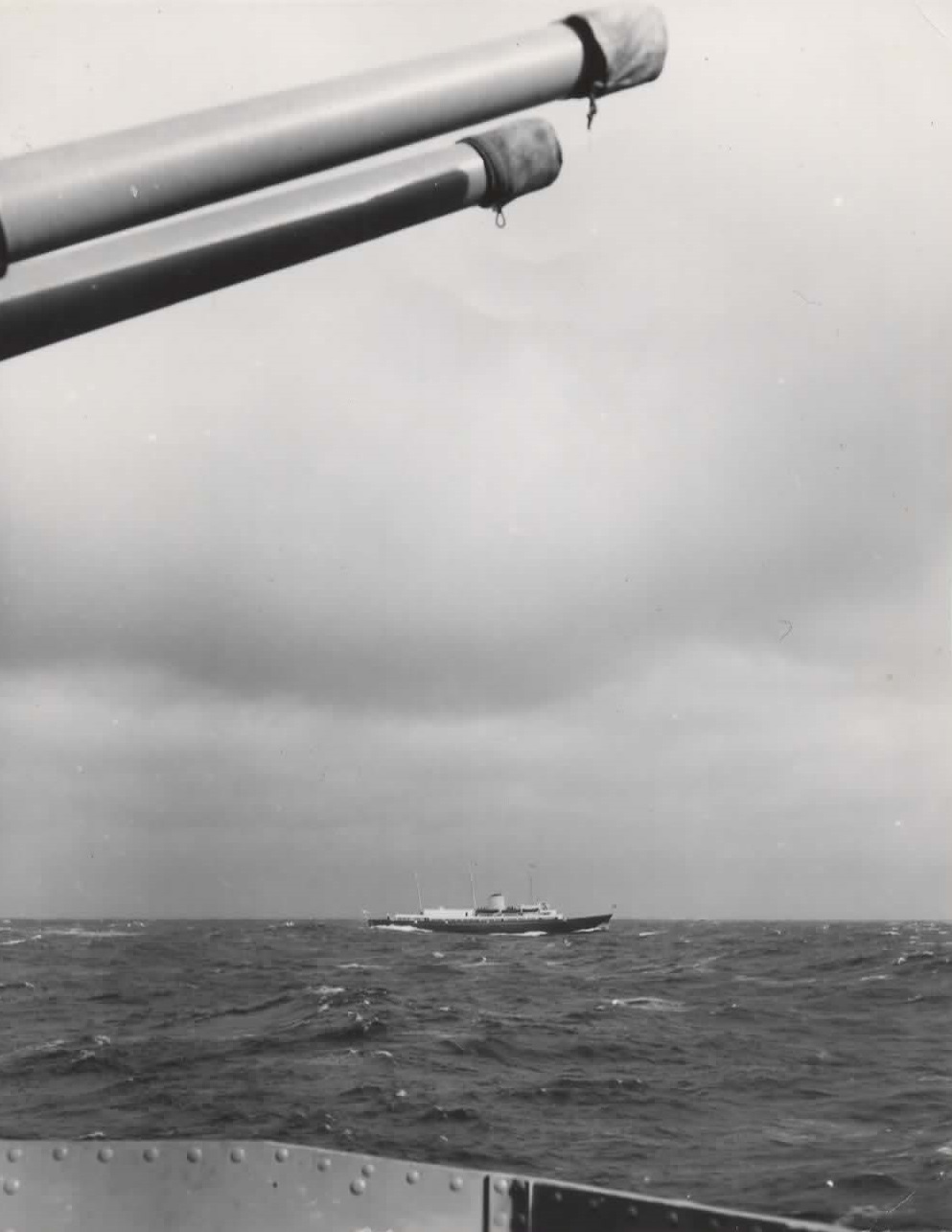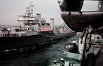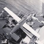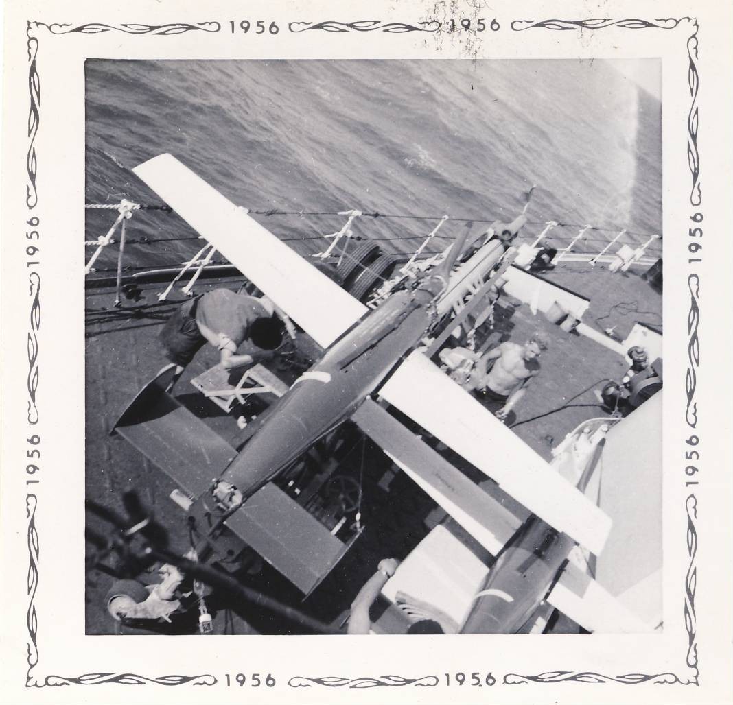 (QUE016) HMCS QUEBEC fires a salute during the opening of the Cape Breton Causeway 13 Aug 1955 // Courtesy of Dave Poidy (QUE017) Target drone on board HMCS QUEBEC on the port side of "A" Turret // Photo developed- printed 1956 // Courtesy of the Naval Museum of Halifax