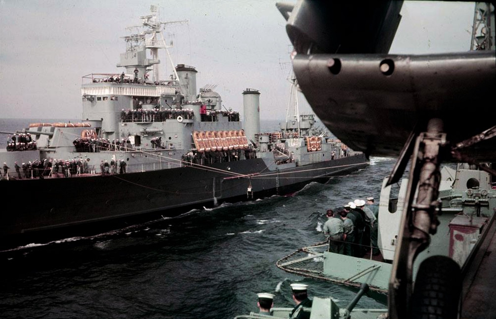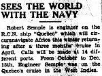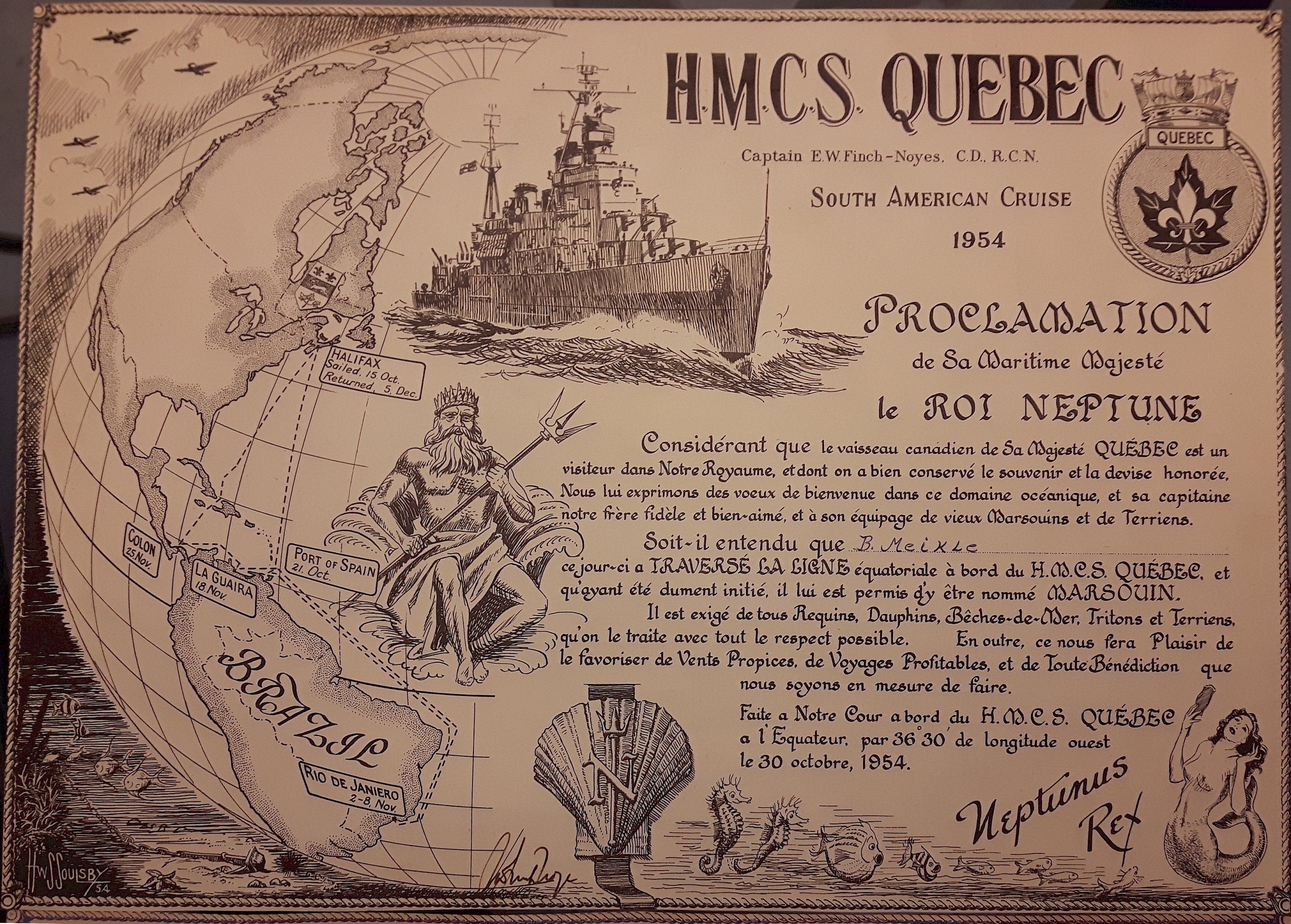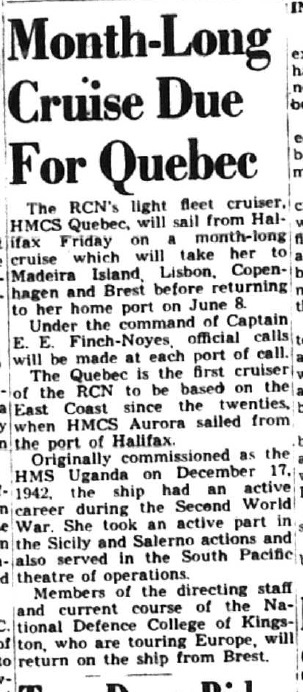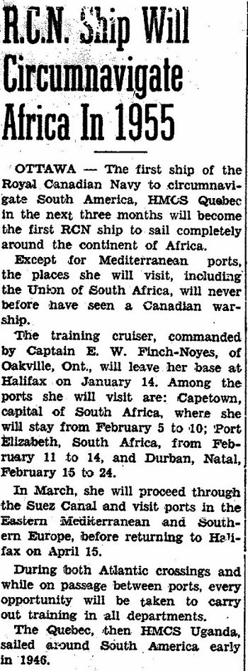 (QUE006) HMCS QUEBEC taking station alongside HMCS MAGNIFICENT for a jackstay transfer, 1953 // Courtesy of Gerald Sullivan (QUE007) HMCS QUEBEC conducting jackstay transfer with HMCS MAGNIFICENT // Courtesy of Ray Bean (QUE008) Month-Long Cruise Due For QUEBEC // HMCS QUEBEC to make month-long cruise with port visits to Madeira Island, Lisbon, Copenhagen and Brest // The Halifax Chronicle-Herald, Tuesday, 27 Apr 1954 // Research by - Courtesy of George Newbury (QUE009) Crossing the Line Certificate for B. Meikle during HMCS QUEBEC'S South American Cruise 1954 // Courtesy of Jason Rowbottom (QUE010) Newspaper Article from the Picton Gazette, 26 Jan 1955 on a PE County sailor, Robert Semple and HMCS QUEBEC'S circumnavigation of Africa // Source: Prince Edward County Archives Microfilm collection // Researched and complied by: © John Lyons 2014