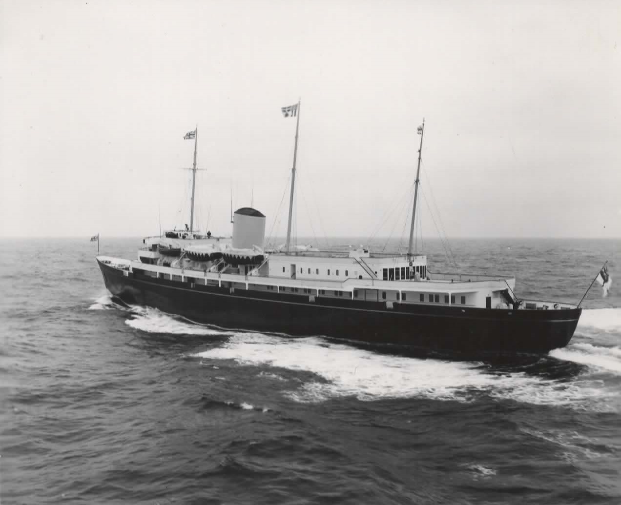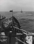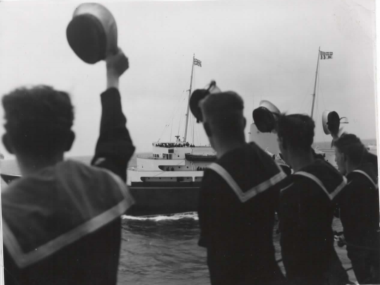 (FW01-FW04) After escorting the Royal Yacht Britannia to mid-ocean, the crew of HMCS QUEBEC salute the Queen with 3 cheers before the QUEBEC returns to Halifax - c1953-54