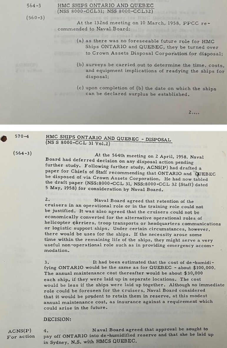 The paying-off of HMCS ONTARIO and HMCS QUEBEC - Minutes of the 564th Meeting of the Naval Board, 1 April, 1958, and Minutes of the 570th Meeting of the Naval Board, 4 June, 1958, fond of Peter Haydon at the Naval Museum of Halifax. // Courtesy of Colin Darlington, Naval Museum of Halifax Volunteer
