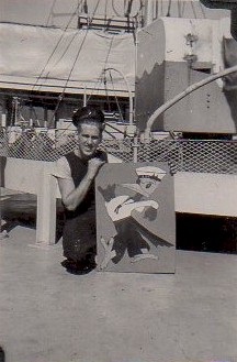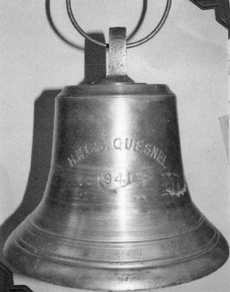 (JS055) HMCS QUESNEL'S bell (JS056 - JS057) Bill Godfrey posing with the gun shield art on HMCS QUESNEL, Jan 1943 (JS058) Gun shield art on HMCS QUESNEL // Jim Silvester designed and painted the eagle insignia while serving in HMCS QUESNEL. It was the crew's intention to paint this on QUESNEL'S gun shield, but this didn't happen. (JS059) HMCS QUESNEL "under the White Ensign"