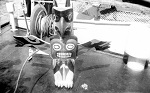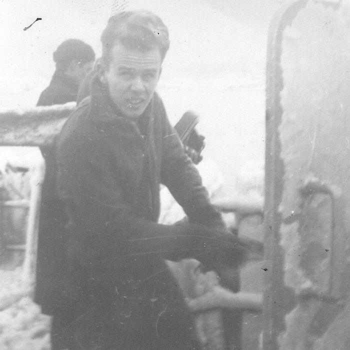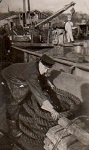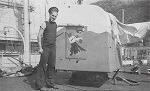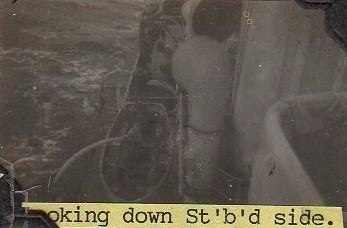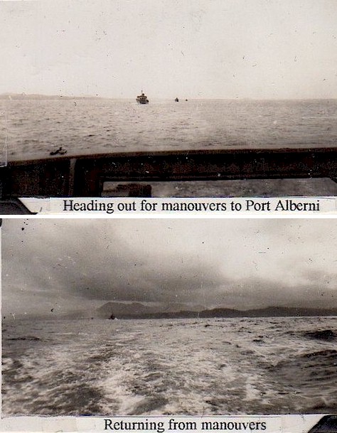(JS232) Boat's crew pulling past a smoke float dropped by an aircraft (JS233) Mousseau and John Quick, Labrador (JS234) Stan Noble standing Quartermaster duty (JS235) HMCS QUESNEL alongside Goose Bay, Labrador (JS236) CERA moving the Thunderbird. Bud Bawden above the CERA. The CERA was a relief from the East coast