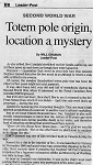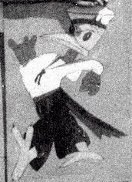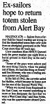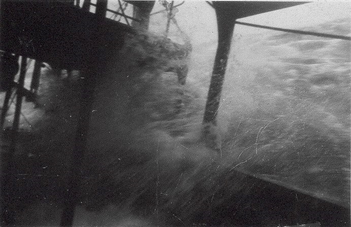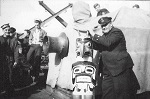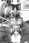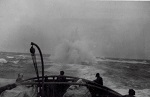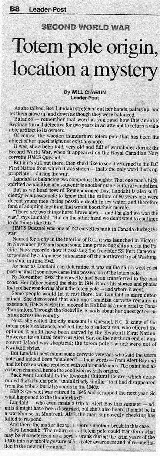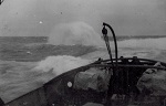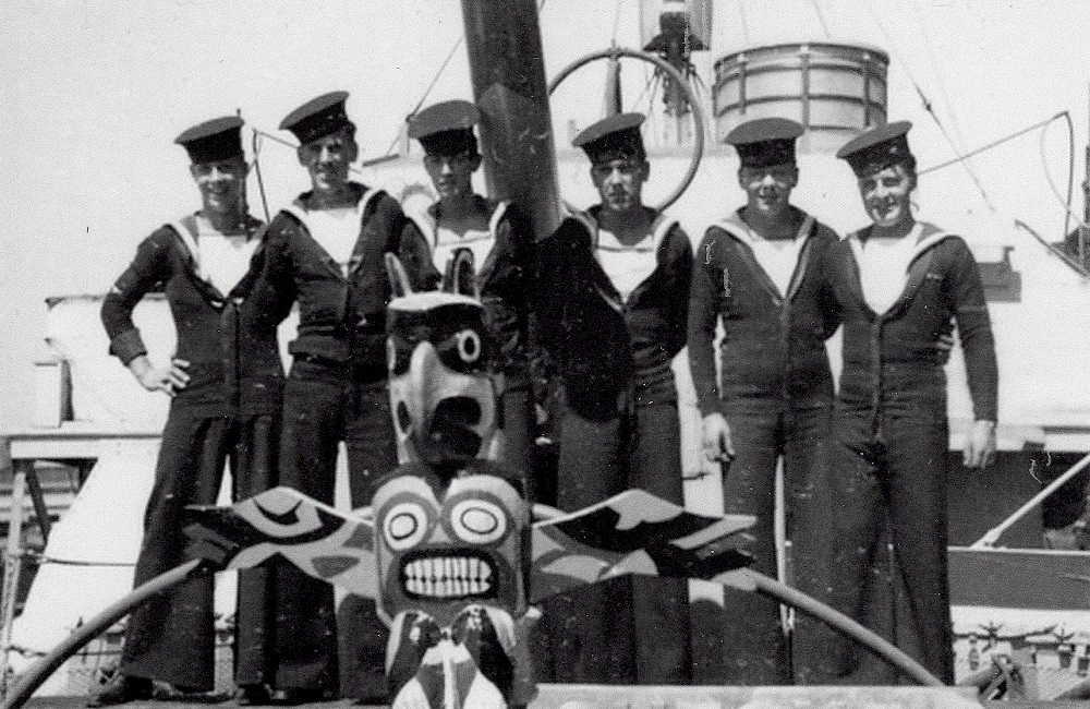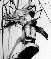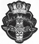 (JS069 - JS070) HMCS QUESNEL in rough seas in the Hecate Strait off the Queen Charlotte Islands, BC (JS071) HMCS QUESNEL'S Thunderbird Jacket Patch (JS072) HMCS QUESNEL'S Thunderbird - During the storm in the Hecate Strait the skipper pulled into Alert Bay. While there, a couple of ratings went ashore and came back with this Thunderbird which came off an Indian grave. It was in pretty bad shape with a lot of worm holes and the wings were missing Our Engine room crew made new wings and repainted it as close to the colours that were on it. The Thunderbird remained with QUESNEL the rest of the war. After the war she was paid off but we don't know what happened to it after that. It would be nice if we could find it again and return it to the grave it came from.