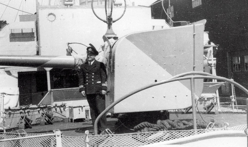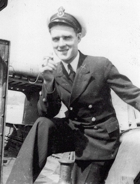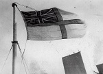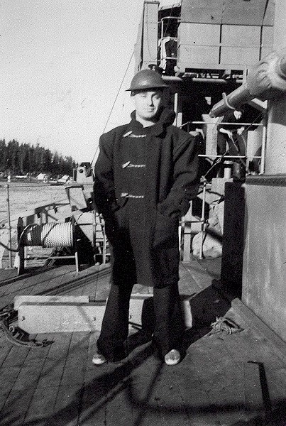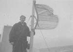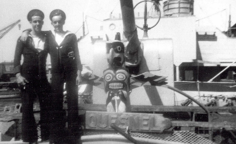 (JS221) Bill Hayes beside a severely weather tattered White Ensign on HMCS QUESNEL K133 (JS222) HMCS QUESNEL K133 in Cullingham Sound, Labrador, Aug 1944