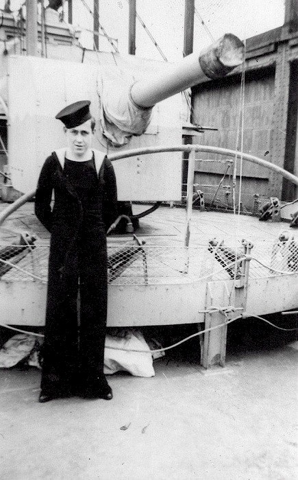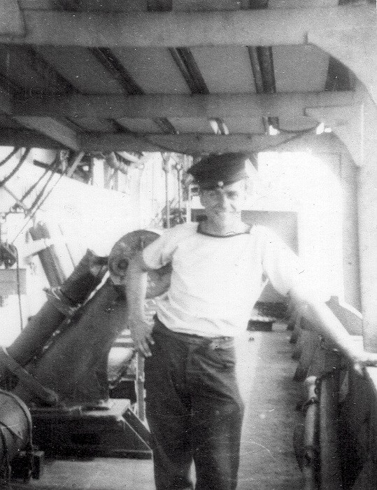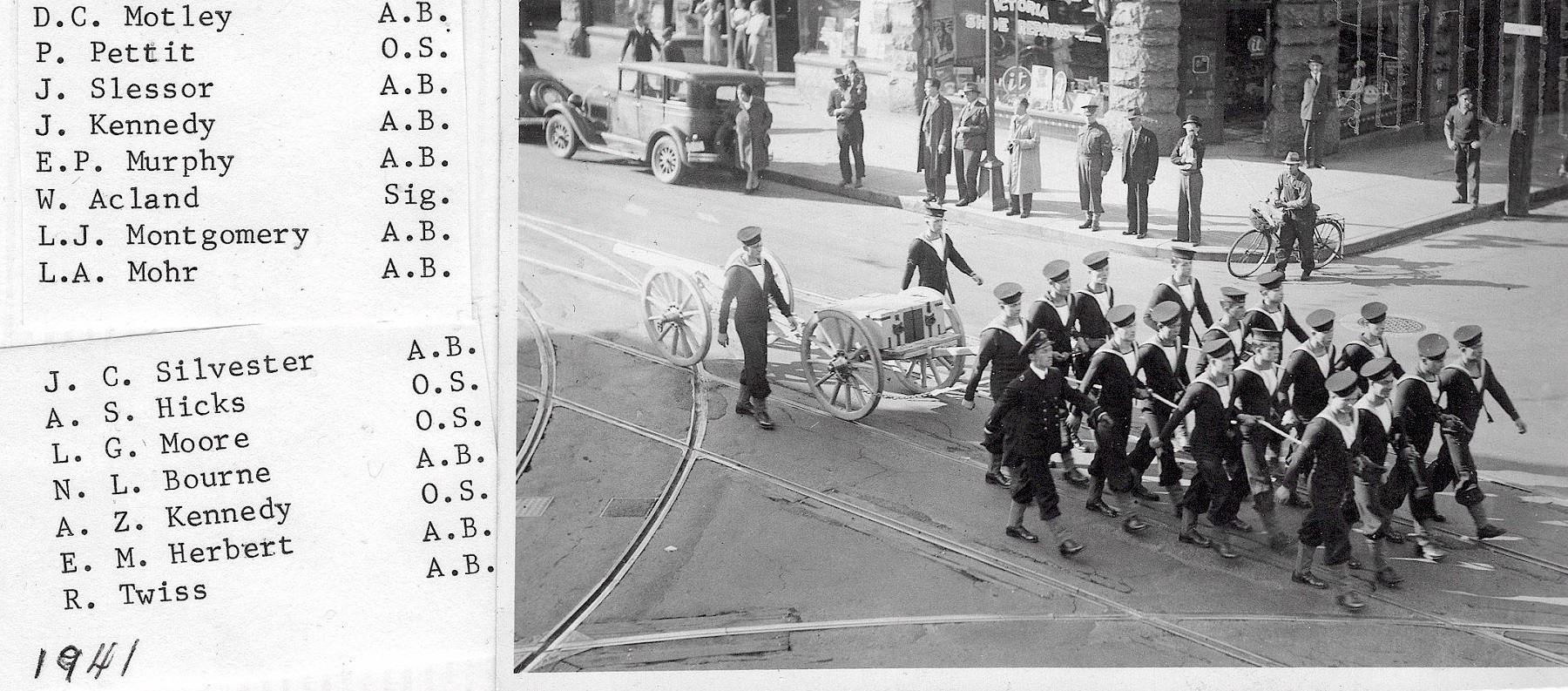 (JS060) Looking aft on HMCS QUESNEL K133 (JS061) After deck on HMCS QUESNEL K133 (JS062) Field Gun Crew from HMCS QUESNEL K133 on parade in Victoria, BC in 1941 - J. Silvester ABQR2; A.S. Hickes, OS; L.G. Moore, OS; N.L. Bourne, AB; A.Z. Kennedy, AB; E.M. Herbert, AB; F. Ticehurst, AB; Roger Twiss, AB; D.C. Motley, AB; Philip Petit; John Slessor, AB; Jerry Kennedy, AB; E.P. Murphy, AB; N. Agland, Sig; L.J. Montgomery, AB; L.A. Mohn, AB (JS063) HMCS QUESNEL K133 (JS064) Jack McKeown on HMCS QUESNEL K133