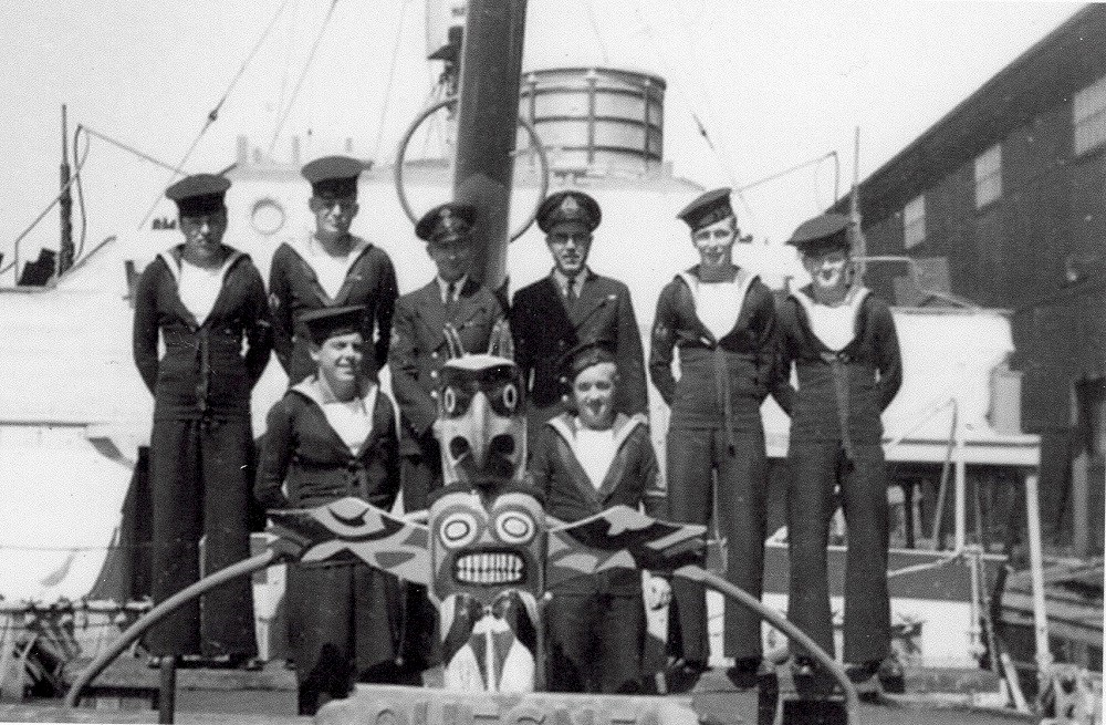 (JS078) Ball, Godfrey, Mahoney, Collins, Christopher and Asseltine with QUESNEL'S Thunderbird (JS079) Unknown, Parker, Morton, Connolly, Mudi, Forbes, Graham, Healey with QUESNEL'S Thunderbird (JS080) ASDIC rates - Murray, Neufeld, Collins, Marano, Graham, McCormick, Larusson with QUESNEL'S Thunderbird (JS081) Officers - Connolly, Brown, Ritchie, Laing (CO), Milledge (XO), Kitchener, Karr with QUESNEL'S Thunderbird