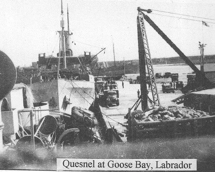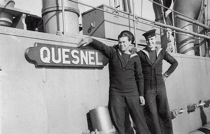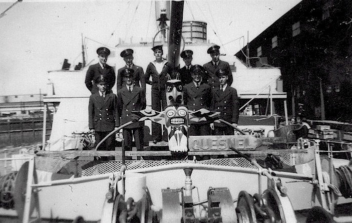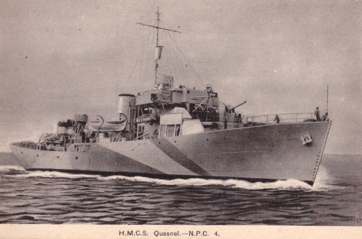 Named for the town of Quesnel, BC, she was built by Victoria Machinery Deport Co., Ltd, Victoria, BC and commissioned on 23 May 1941 at Esquimalt. She displaced 950 tons with a draught of 8'3" forward and 13' 5" aft when fully loaded. Her overall length was 205 feet with a beam of 33 feet. Her single steam reciprocating engine gave her a maximum speed of 16 knots. After her "shake down" cruise to Prince Rupert in June 1941, the remainder of the year was spent performing various duties such as ASW training, towing gunnery targets and providing sea training to junior officers from Royal Roads. Shortly after the attack on Pearl Harbor, the QUESNEL was part of the rounding up of Japanese fishing vessels on the west coast of Vancouver Island. She also acted as a tender to the Battleship HMS WARSPITE when she was working up in the strait of Juan De Fuca and Nanoose Bay. In the spring of 1942, HMCS QUESNEL carried out A/S patrols in the Strait of George and in Queen Charlotte and Millbank Sounds. She also provided protection to individual ships from US ports to Alaska. During this time HMCS QUESNEL provided a screen to RMS Queen Elizabeth while she waited off Esquimalt for ideal tidal conditions to be dry docked in Feb 1942. In June 1942 HMCS QUESNEL provided escort to the US tanker Lombardi, arriving in Kodiak, Alaska on 16 Jun 1942. En route back to Esquimalt, on 20 Jun 1942, she intercepted a message intended for HMCS EDMUNDSTON, requiring immediate assistance for the Fort Camosun, torpedoed by a Japanese submarine, position 47 22 N 125 30 W, approx 70 miles south west of cape Flattery. Several Canadian and US ships responded but QUESNEL was first on the scene. On approaching the Fort Camosun HMCS QUESNEL picked up a contact and delivered a depth charge attack. Visible results were negative and contact was not regained. The entire crew of Fort Camosun, 51 men, were rescued by HMCS QUESNEL. With the assistance of HMCS EDMUNDSTON, HMCS VANCOUVER and tugs, the Fort Camosun was brought to anchor in Neah Bay for pumping out before eventually making to to Esquimalt for repairs. The balance of the summer of 1942 was spent on A/S patrol and intercepting unidentified ships in BC waters. On 13 Sep 1942, HMCS QUESNEL, in company with HMCS TIMMINS, HMCS DUNDAS, HMCS EDMUNDSTON and HMCS NEW WESTMINSTER departed Esquimalt for Halifax via the Panama Canal. She arrived in Halifax on 13 Oct 1942 and was assigned to Western Local Escort Force until Jun 1944. On 11 and 12 May 1943, while escorting convoy ON-180, QUESNEL gained a contact. A depth charge attack was made but no further contact was made. With the division of the force into escort groups in Jun 1943, she became a member of EG W-1. During this period she underwent a refit, including fo'c's'le extension, from early Sep to 23 Dec 1943, at Pictou. This refit was followed by workups in St. Margaret's Bay and Bermuda. In Jun 1944 QUESNEL joined Quebec Force and spent five months escorting Labrador-Quebec convoys. In Nov 1944 she was transferred to Halifax Force, going to Sydney for refit and, on completion late in Jan 1945, to Bermuda for workups. She resumed escort duty late in Mar 1945, temporarily attached to EG W-5 and W-8 of WLEF until the end of the war. While escorting her final convoy, HX-335, HMCS QUESNEL rescued 17 of the crew from the damaged Esso Pitsburg on 12 May 1945, arriving at Halifax on 25 May 1945. On 07 Jun 1945, she landed her ammunition at Shelburne, NS and two days later arrived at Sydney, NS to de-store. HMCS QUESNEL then proceeded to Sorel, Quebec where she was paid off on 03 Jul 1945. She was sold on 05 Oct 1945 to the United Steel and Metal Company, Hamilton, Ont., and was broken up there in 1946. During her time escorting convoys in the Atlantic, HMCS QUESNEL participated in 48 convoys and made ports of call at Goose Bay, Labrador; St. John's, Nfld; Sydney, NS; Halifax, NS; Saint John, NB; Boston, Mass; New York, NY; and several ports in Quebec.