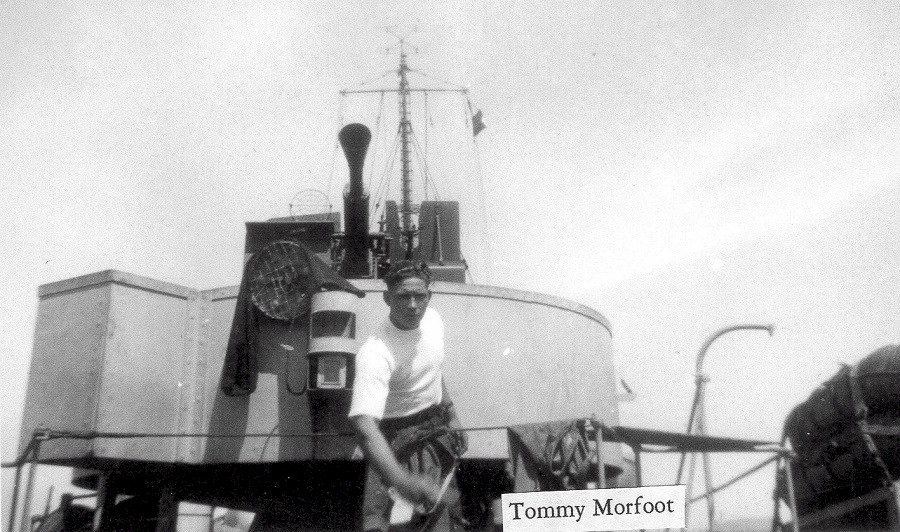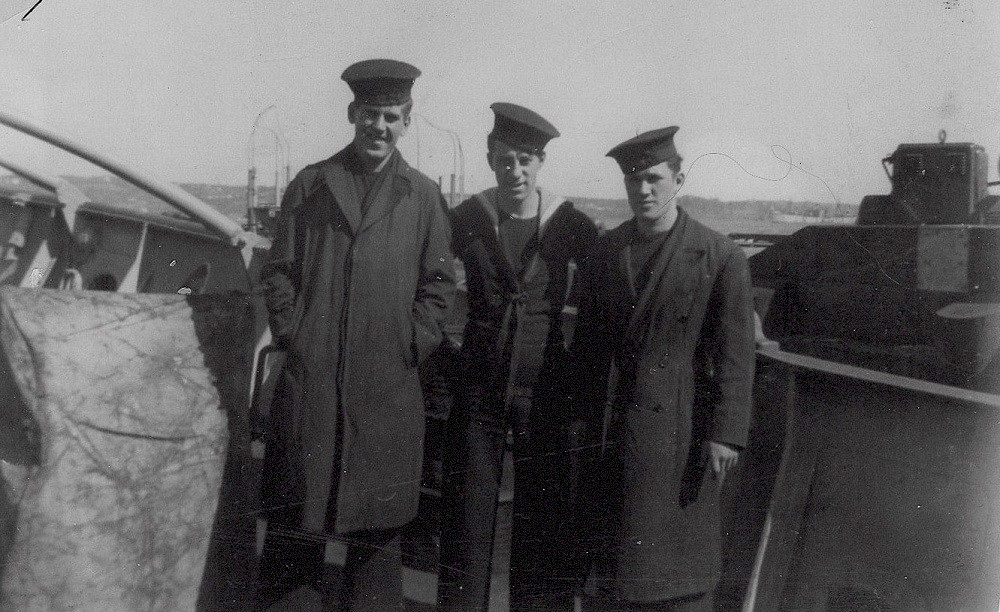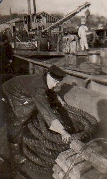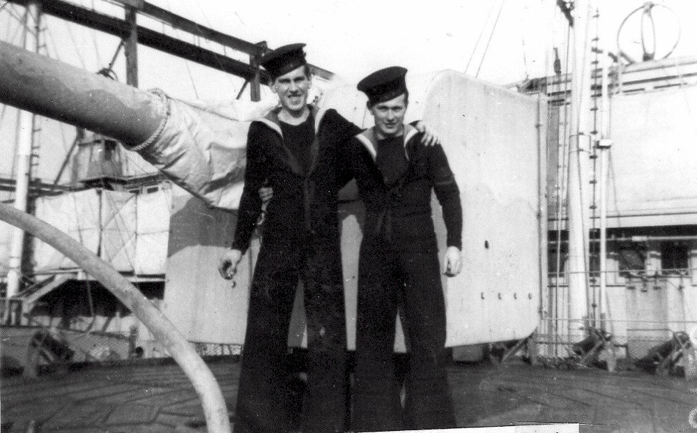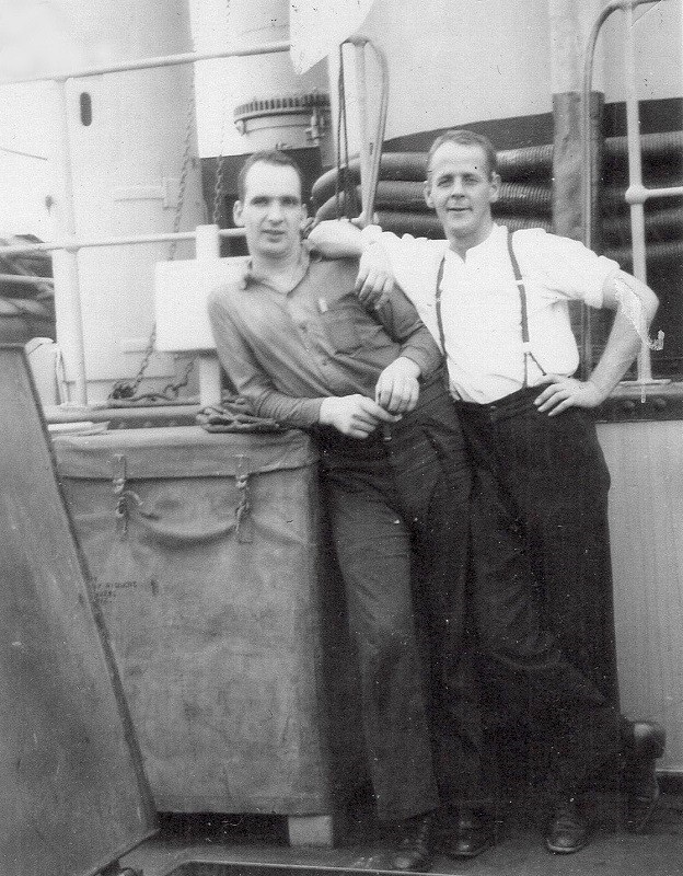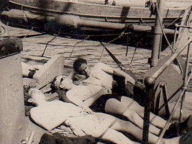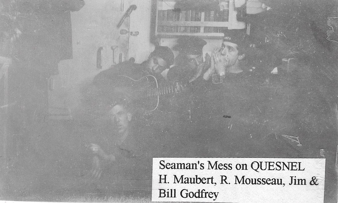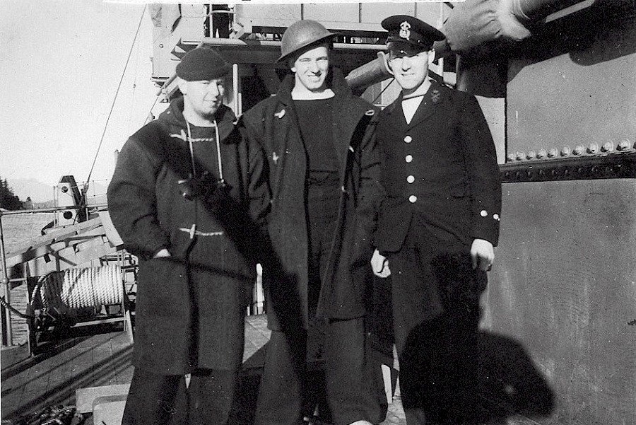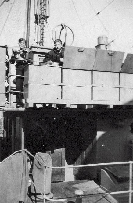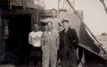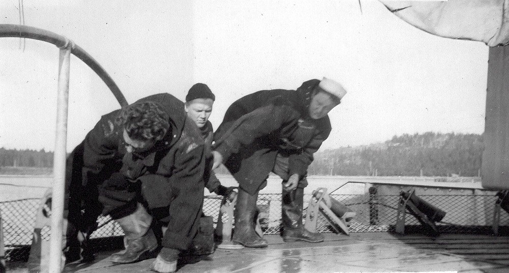 (JS112) Bill Godfrey and Frank Grant on the fo'c's'le of HMCS QUESNEL K133 (JS113) J. Retallick, Sto, E.P. Murphy, Tel and "Duke" Dawson on HMCS QUESNEL K133 - Dec 1941 (JS114) Looking down starboard side on HMCS QUESNEL K133 (JS115) Looking aft on HMCS QUESNEL K133 (JS116) Bud Bawden and Jim Silvester