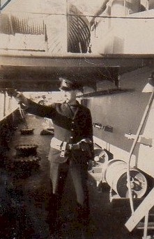 (JS216) Jim Silvester, Frank Hewlko and Adeline Bubella, US Wave (JS217) Clarke, Knott, Grant, Bolding, Cairn, Bawden, Johnson (JS218) A.G. Phillips on HMCS QUESNEL (JS219) Bill Godfrey on HMCS QUESNEL, Jun 1944 (JS220) Howie Trawick beside a severely weather tattered White Ensign on HMCS QUESNEL K133