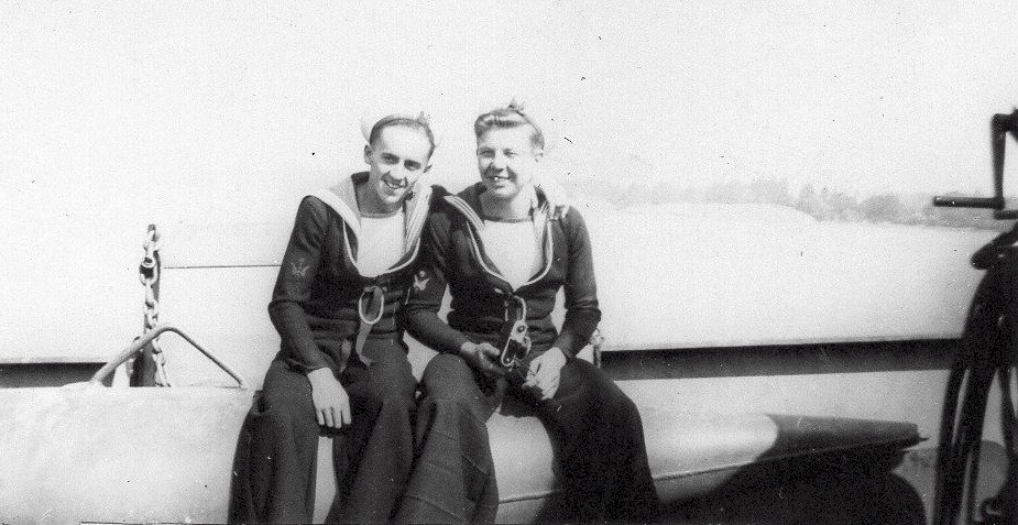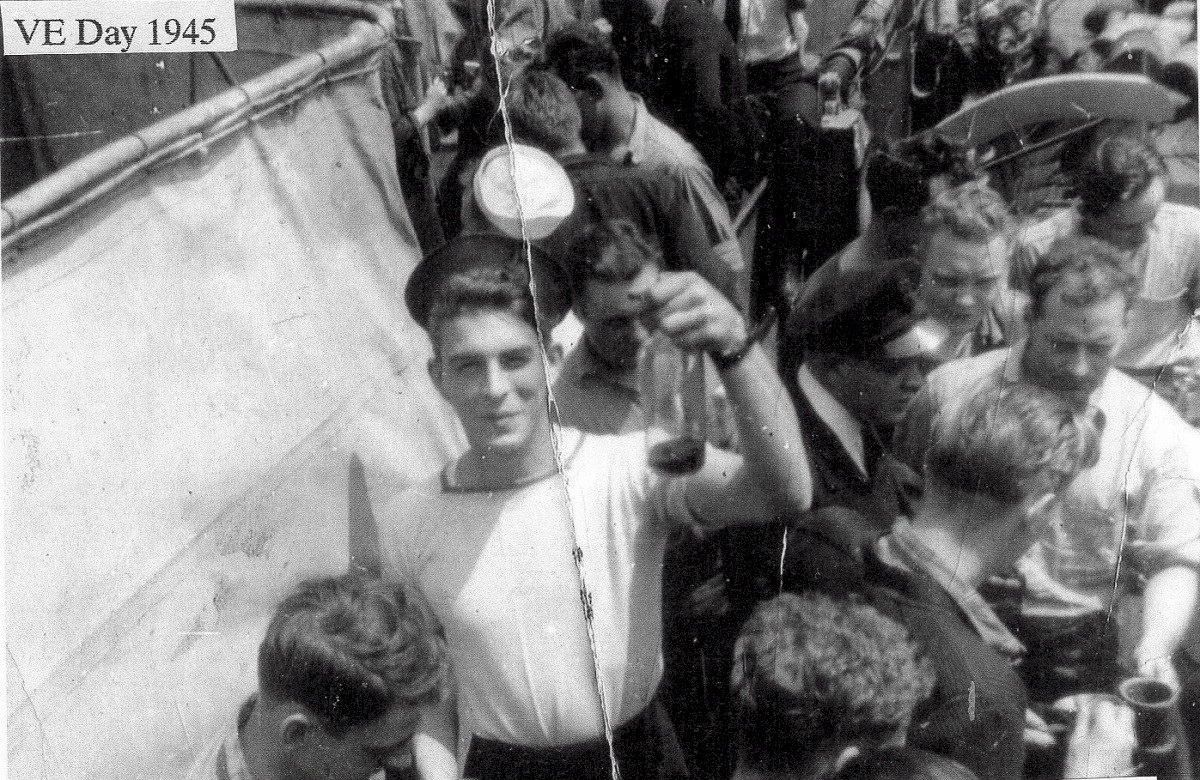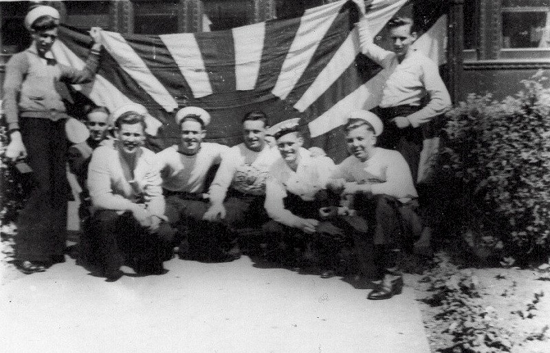 (SN006) VE Day 1945, HMCS QUESNEL - Stan Noble at US Staten Island Frontier Naval Base, New York (SN007) Frank Hewlko (SN008) Stan Noble and "Minty" Larusson (SN009) Eddie Neufeld, Harding Murray, McDonald, Bremner (SN010) Clayton Ball and Ernie Knott with QUESNEL'S Thunderbird