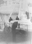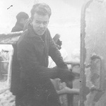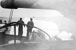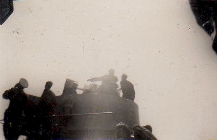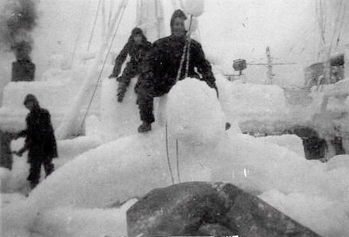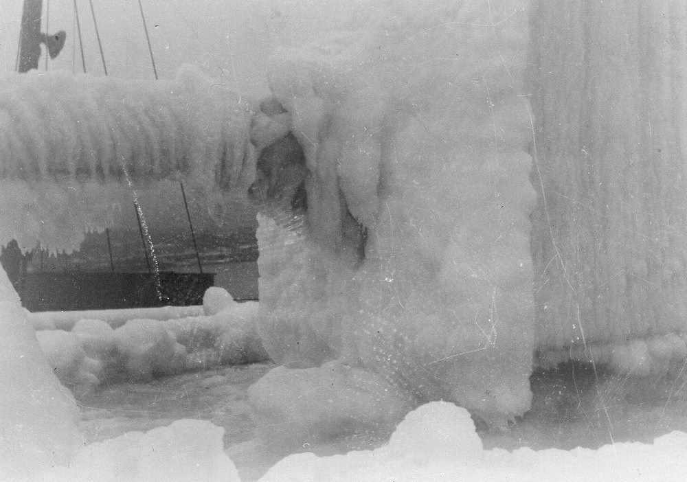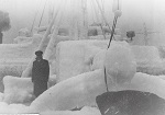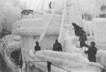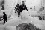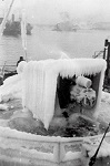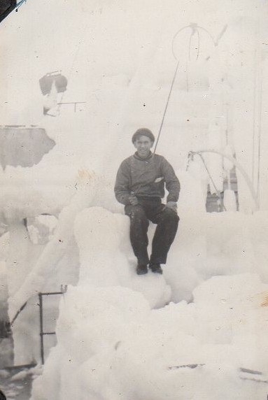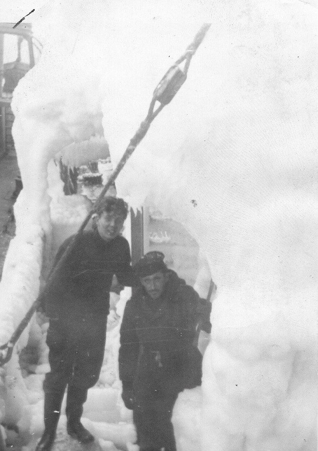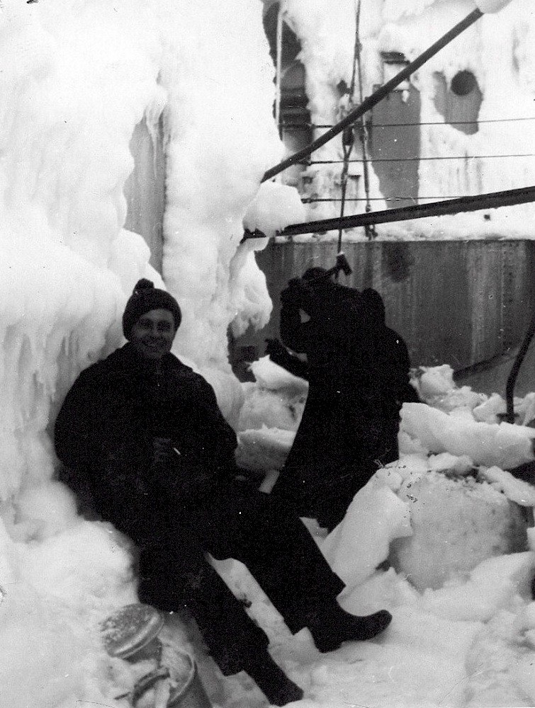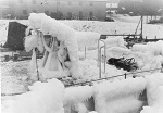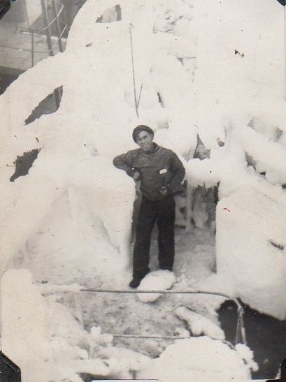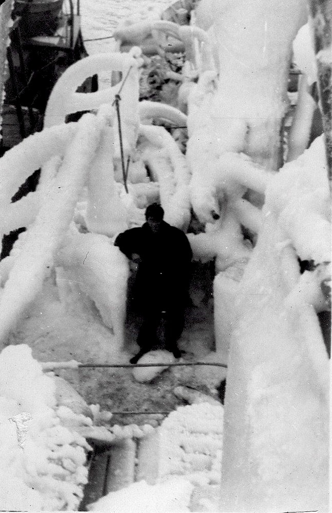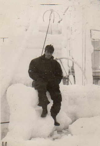 HMCS QUESNEL iced up after returning from convoy duty, Dec 1942 (JS165) Harry Bloomfield by an ice covered signal light (JS166) Bud Bawden and Bill Hayes (JS167) Starboard side, looking aft (JS168) Bill Godfrey (JS169) Tommy Simpson