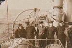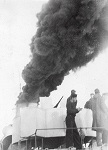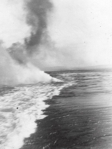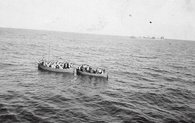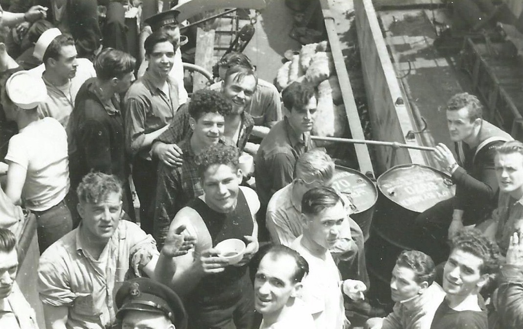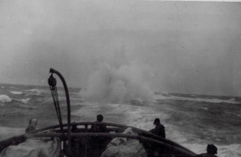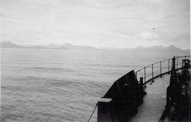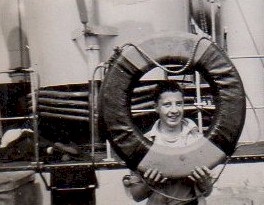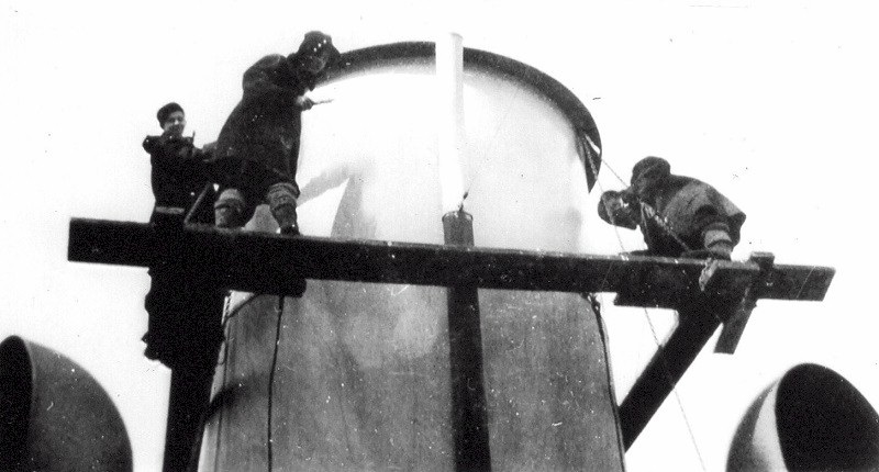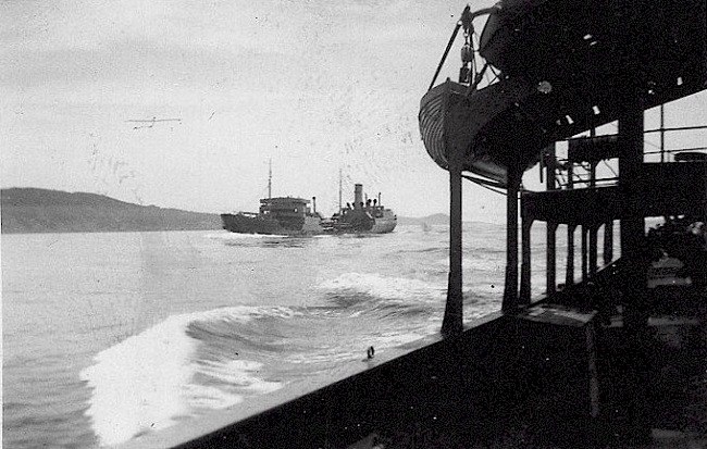 (JS127) HMCS QUESNEL K133 enroute "To Kodiak Alaska" - 16 Jun 1942 (JS128) HMCS QUESNEL K133 (foreground) escorting the US tanker Lombardi to Kodiak, Alaska (JS129) HMCS QUESNEL Rescuing the crew of the Fort Camosun, 20 Jun 1942. All 52 crew were in these 2 lifeboat (JS130) Doswell and Lucas on HMCS QUESNEL K133 (JS131) A. Donnet, C. Stevens and Robert Holland painting the funnel on HMCS QUESNEL K133