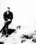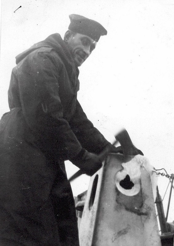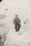HMCS QUESNEL iced up after returning from convoy duty, Dec 1942 (JS150) the 4-inch gun (JS151) Jim with ice-up seaboat (JS152) Bud Bawden (JS153) Bridge and gun deck (JS154) E. Neufeld sitting on the 4-inch gun