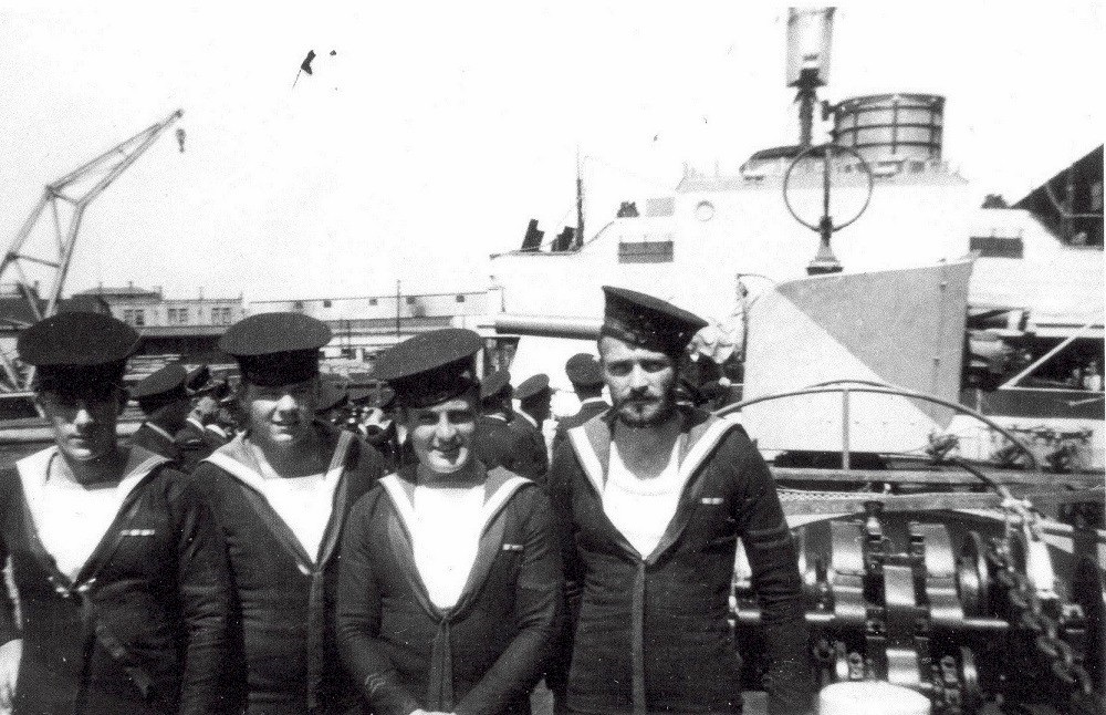 (JS211) E. Knott, A. Philips, S. Boroviak, E. Neufeld on HMCS QUESNEL K133 (JS212) E. Neufled, S. Boroviak, E. Knott, A. Philips on HMCS QUESNEL K133 (JS213) Knott, Dugan, "Newfie", Philips on HMCS QUESNEL K133 (JS214) Bob Dugan, Philips on HMCS QUESNEL K133 (JS215) Bob Kett