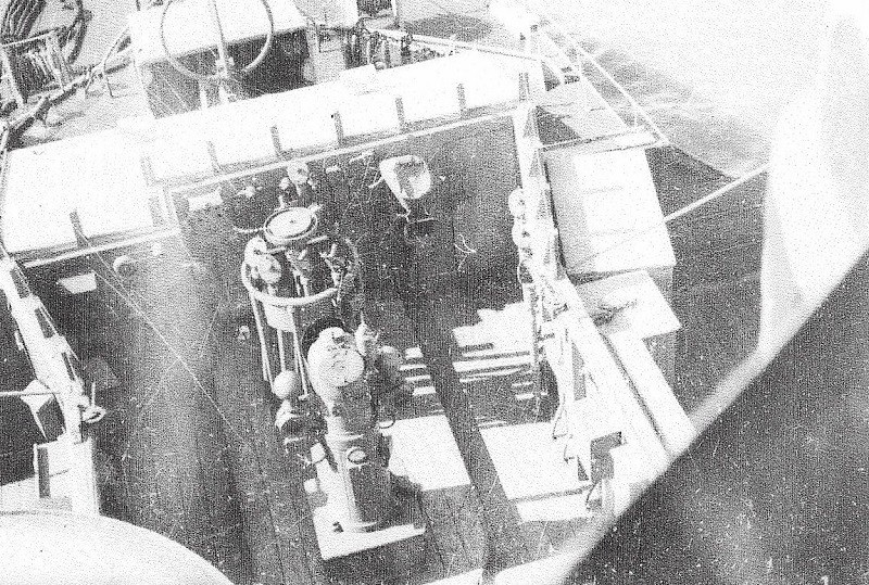 (JS237) Robert Robbins on the lamp (JS238) Vickaryous and his new wife (JS239) Sam Beaver and "Floof" (JS240) HMCS QUESNEL, 10 Sep 1942, Position: 49.00 N / 126.03W - This photo is identified as being taken in Sep 1942. Webmaster's note: QUESNEL did not get her extended fo'c's'le and main mast moved aft of the bridge till her refit Sep-Dec 1943. This photo was taken in either 1944 or 1945. (JS241) Gun and bridge of HMCS QUESNEL. Note the Thunderbird on the mast in front of the crow's nest.