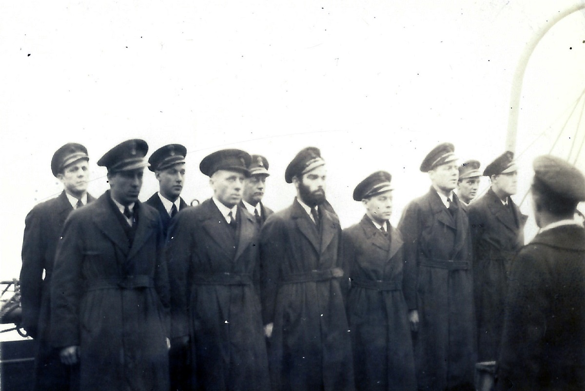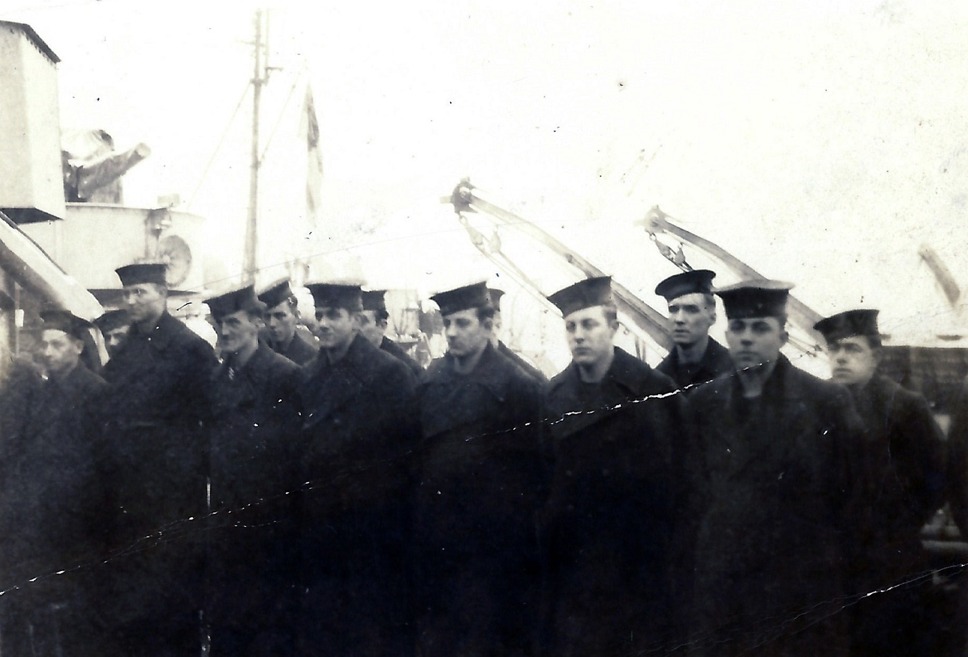 Herbert Higgs 3rd from left in newspaper article photo From the collection of Herbert Higgs, LS, RCNVR Courtesy of Bob Higgs.