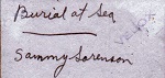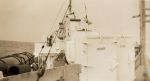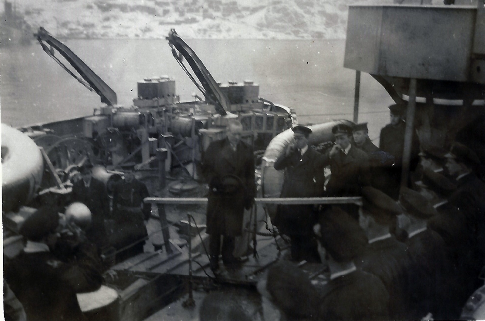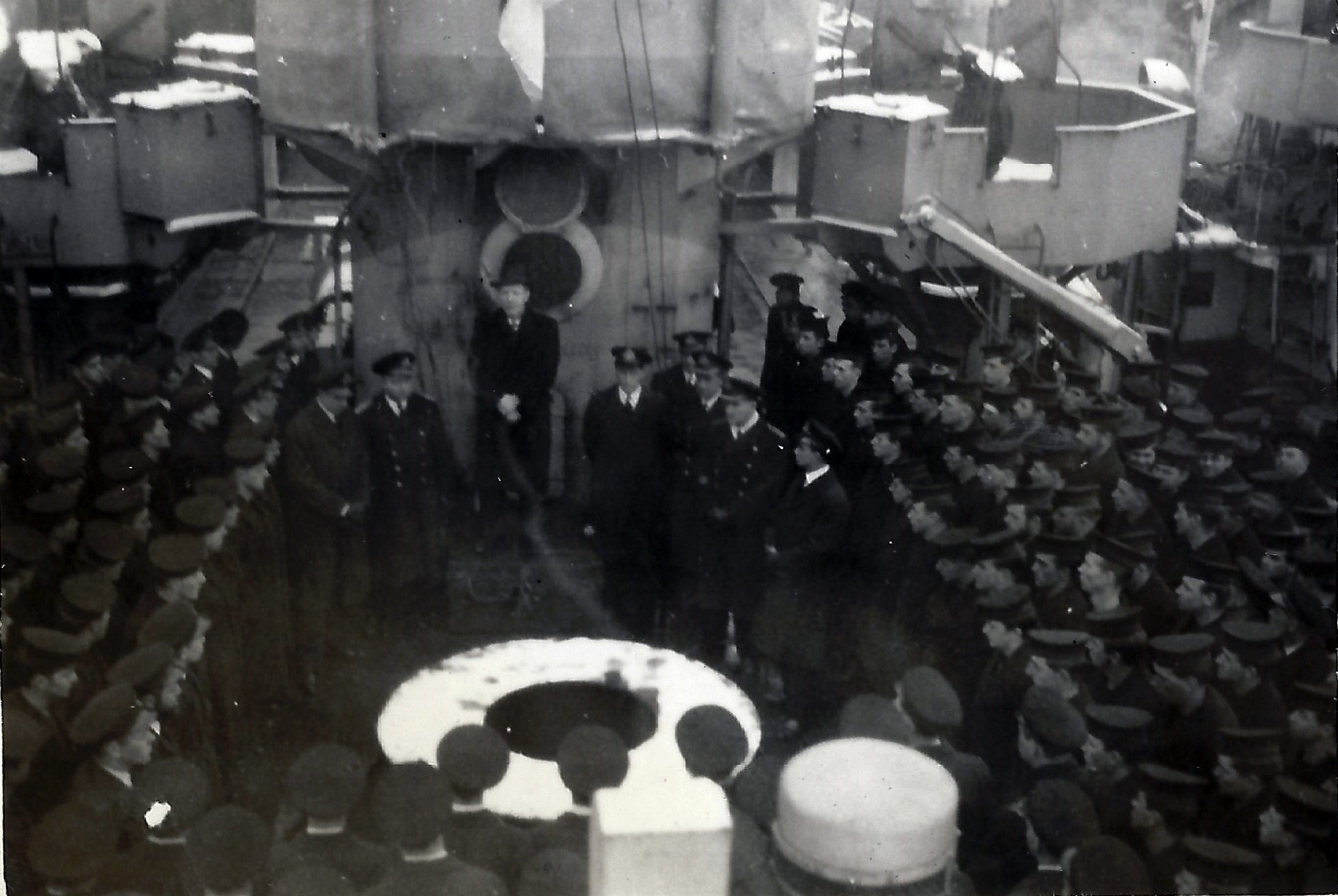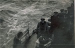 Writers. (JB06) Sailors on HMCS RESTIGOUCHE - L-R: Abraham, unknown, PO Walsh, CPO Rigby, PO Howard, Anderson, PO Rigg, PO Wilson. Note - it is possible the two in the seaman's rig are Petty Officers (Square Rig POs). (JB07-JB10) Memorial Service for Ordnance Artificer Svend Solberg (Sammy) Sorensen, MPK - 28 Nov 1942. Ordnance Artificer Sorensen was lost at sea presumed drowned. He had been on Cypher watch in the ship's office which is located aft. He was bringing the log up to the bridge and got as far as the starboard torpedo davit when the ship rolled. Before being engulfed in sea water Ordnance Artificer Sorensen was seen clutching the davit with both arms. However he was washed away carried aft, dashed against the forward D/C thrower, and then washed overboard. His body was never recovered.