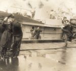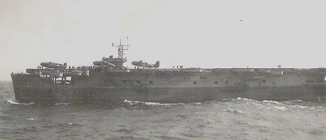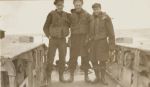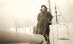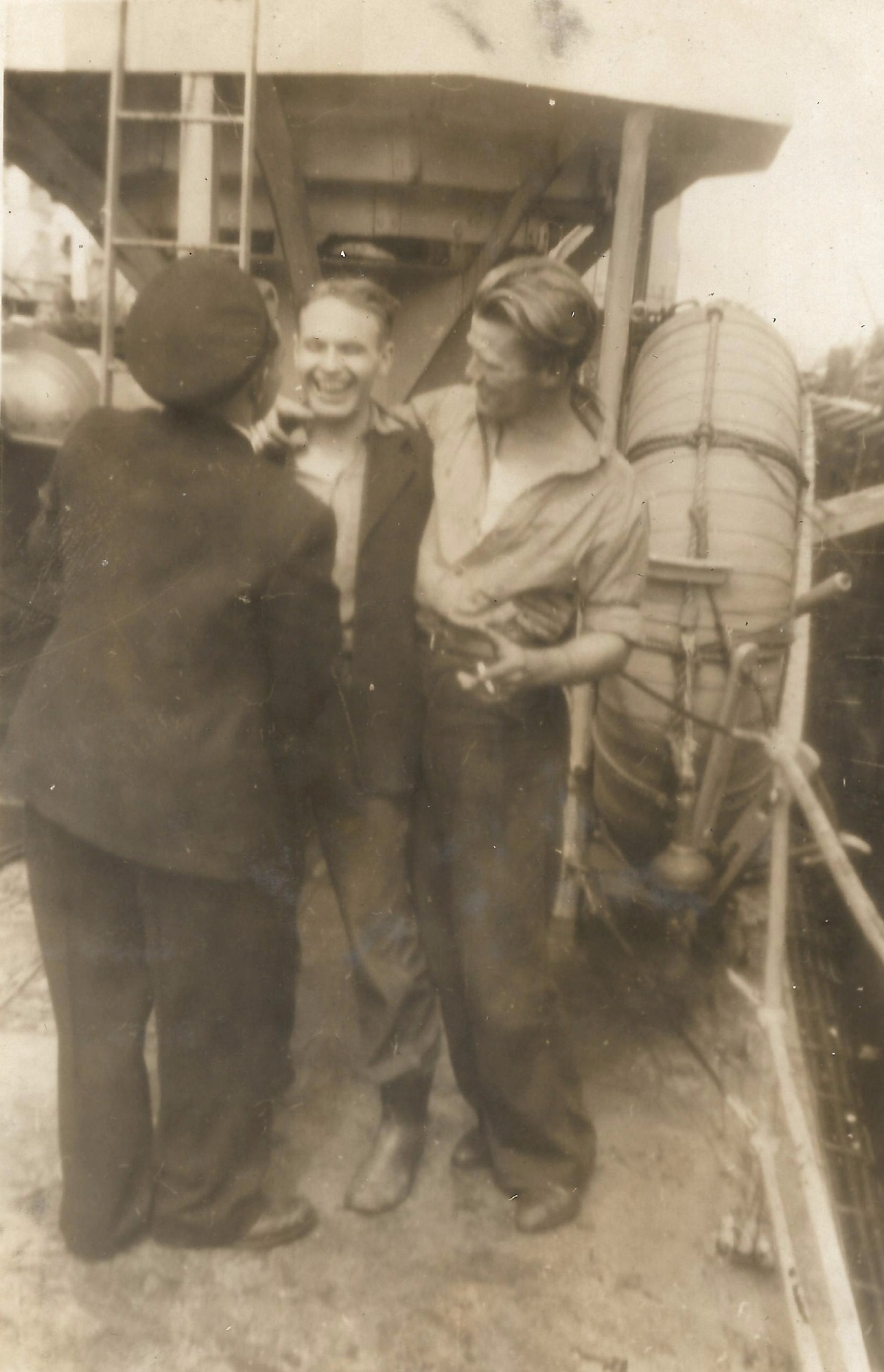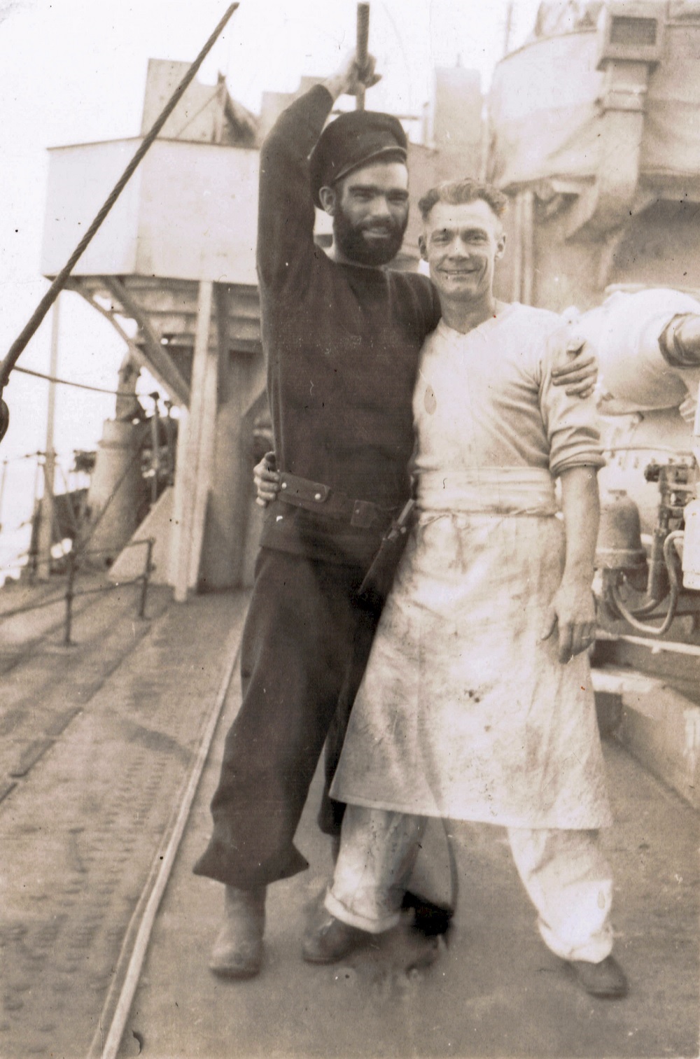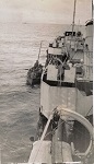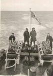 (ES006) Petty Officer Cook Hugh Shields, HMCS RESTIGOUCHE H00 (ES007) Three crewmembers from HMCS RESTIGOUCHE H00. Centre - Ordnance Artificer Svend Solberg Sorensen - lost at sea 28 Nov 1942 (ES008) A few crew on the stern of HMCS RESTIGOUCHE H00 (ES009) Unknown aircraft carrier seen from HMCS RESTIGOUCHE H00 (ES010) Unknown vessel with landing craft on deck as seen from HMCS RESTIGOUCHE H00