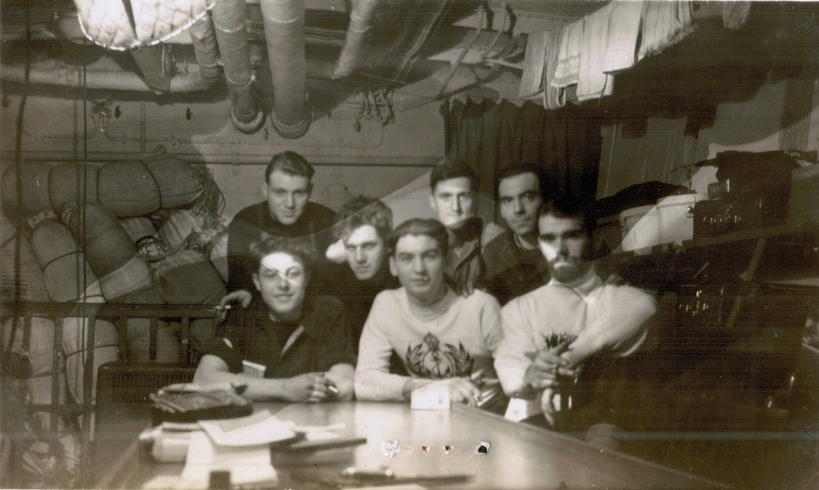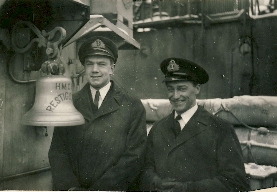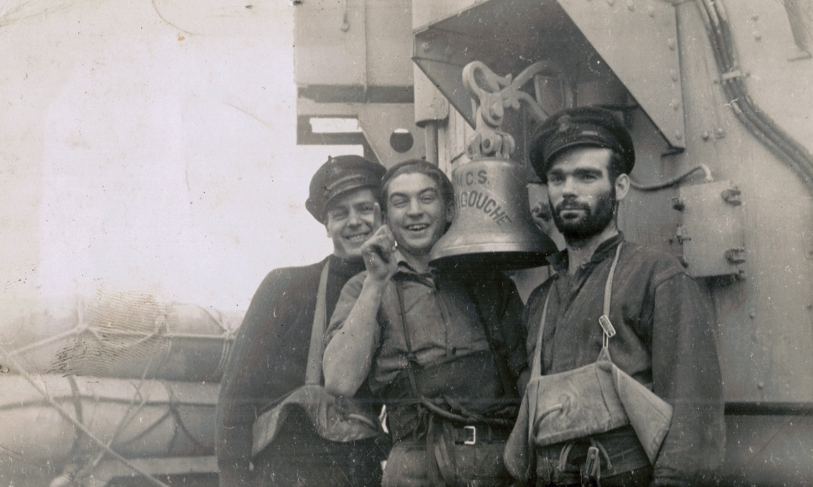 (JB16) John Burchell (left) and Jimmie Finn, 11 mess, HMCS RESTIGOUCHE (JB17) Jimmie Finn on HMCS RESTIGOUCHE (JB18) Jimmie Finn (left) and two unidentified shipmates on HMCS RESTIGOUCHE (JB19) L-R: Unknown, Jimmie Finn and John Burchell on HMCS RESTIGOUCHE by the ship's bel (JB20) STs - 11 Mess, HMCS RESTIGOUCHE