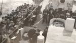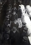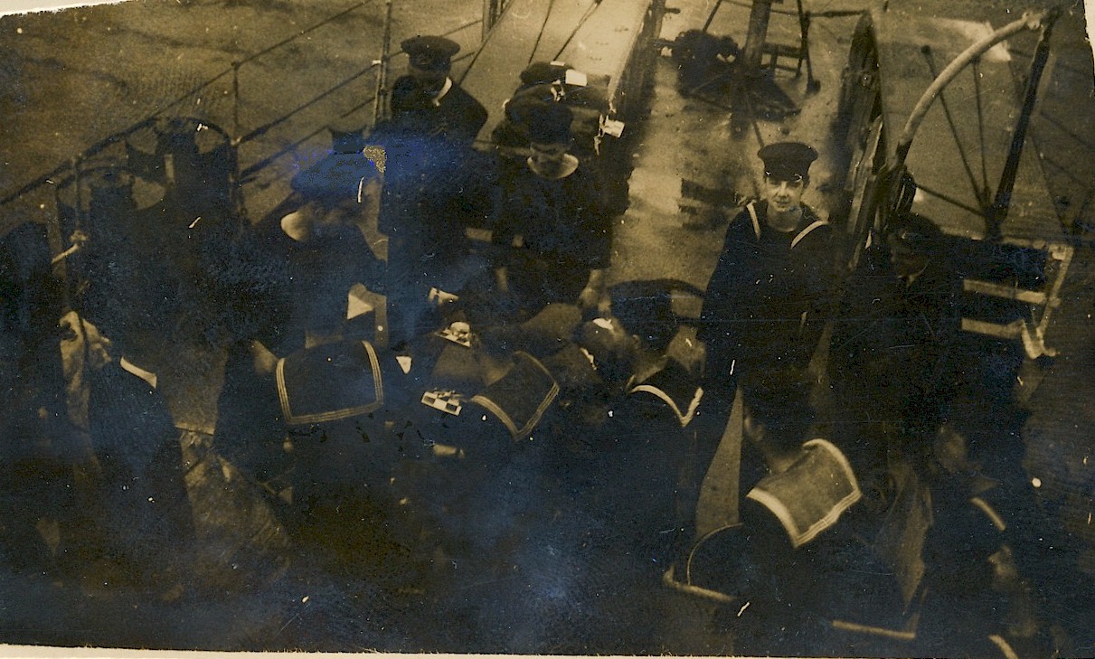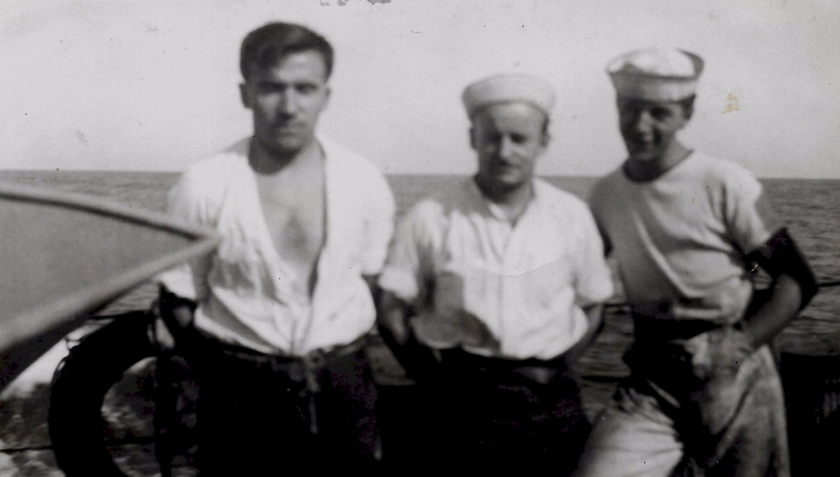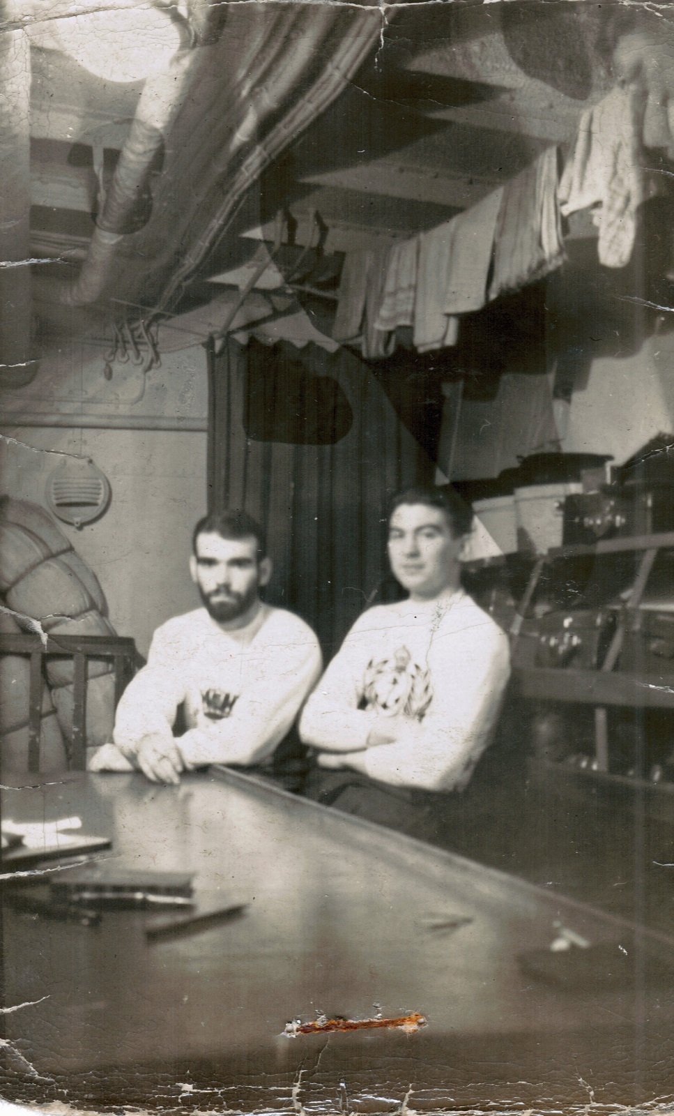 HMCS RESTIGOUCHE, Christmas 1942, Belfast, Ireland (OM04) event on the quarter deck - possibly tot time (OM05) CO for the day - "LCdr" Anthony Bianco, youngest sailor on the ship - HMCS RESTIGOUCHE, Christmas 1942 (OM06) "OS" Desmond Piers, "LCdr" Anthony Bianco, and Chief Bissky (who is wearing an OS or AB's uniform) - HMCS RESTIGOUCHE, Christmas 1942 (OM07) Two unknown sailors on HMCS RESTIGOUCHE