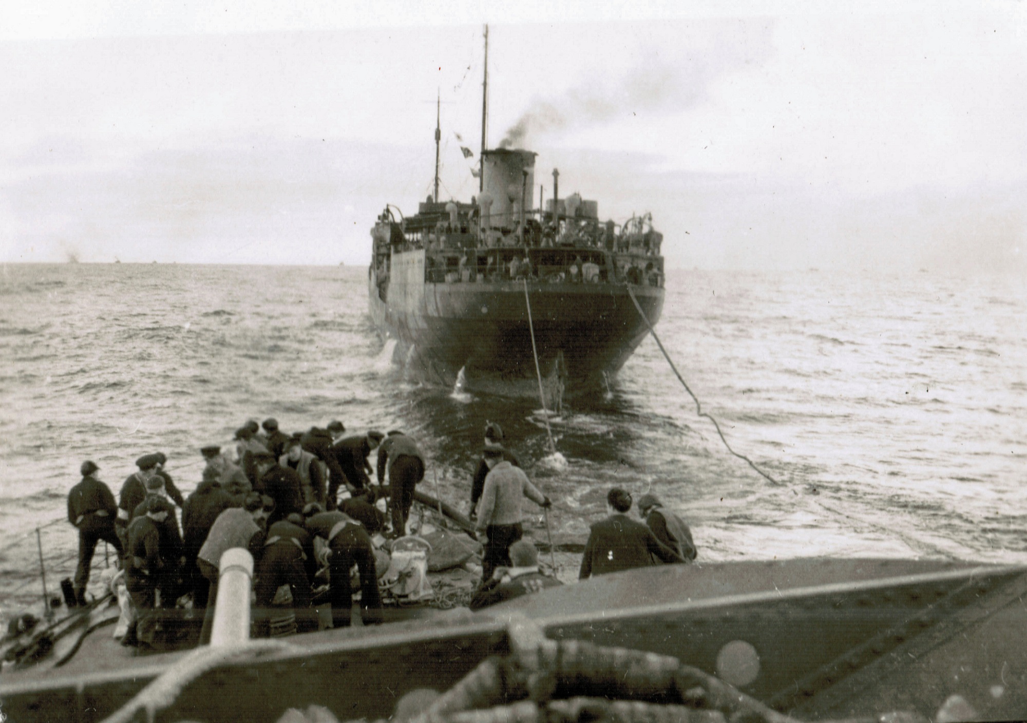 (JB30-JB32) HMCS RESTIGOUCHE conducts stern fueling from oiler in convoy