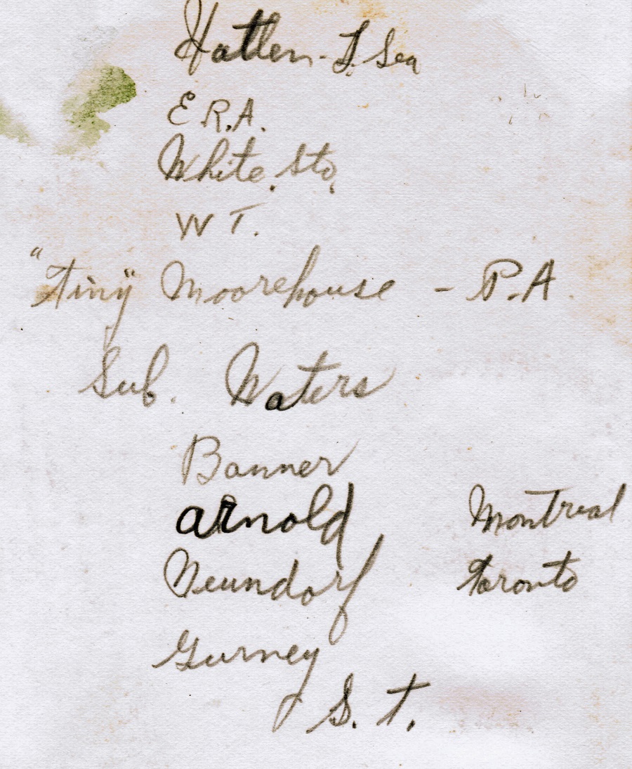 Names on the back of the photo: L. Sea Hatlen; ERA; Sto White; WT; "Tiny" Moorehouse - PA; SLt Waters; Banner; Arnold (of Montreal); Neundorf (of Toronto); Gurney; S.T.