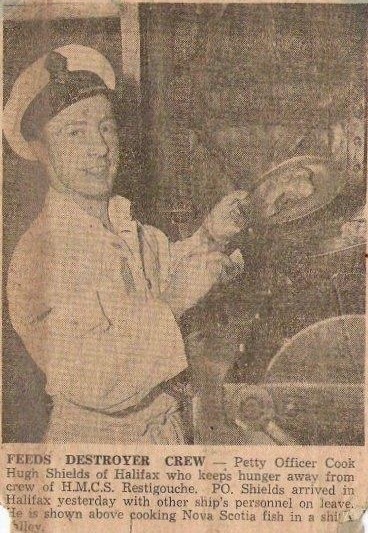 V.E.-Day in Halifax - HMCS RESTIGOUCHE (27) Back: Ringer, Hart, Davies, Broski, Metcalf, Baker; Front: MacKinnon, Kimberley. Note: MacKinnon is front left, not known which of the other two is Kimberley on HMCS RESTIGOUCHE (29) Broski, Shaver, Moose on HMCS RESTIGOUCHE (30) Chief Cook Saunders, Teeple and Ron Critchley on HMCS RESTIGOUCHE From the collection of Ron Critchley Courtesy of Diane Brown