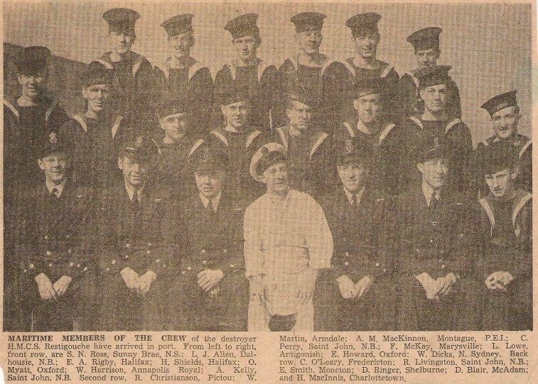 (ES019) Maritime Crew Members of HMCS RESTIGOUCHE H00 Front Row (L-R) - S.N. Ross, L.J. Allen, E.A. Rigby, PO Hugh Shields, O. Myatt, W. Harrison, A. Kelly Second Row (L-R) - R. Christianson, W. Martin, A.M. MacKinnon, C. Perry, F. McKay, L. Lowe, E. Howard, W. Dicks Back Row (L-R) - C. O`Leary, R. Livingston, Eldred Morton Smith, D. Reinger, D. Blair, H. MacInnis From the collection of Eldred Smith Courtesy of Paul Smith