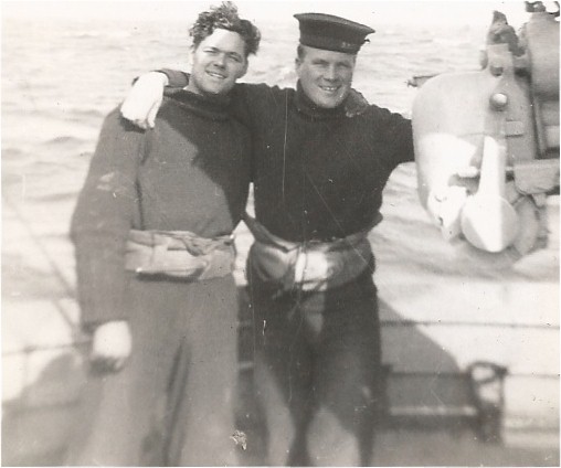 (JB21) SA John Burchell (left) and Chief Rainsford on HMCS RESTIGOUCHE (JB22) SA Chillcot by depth charge thrower on HMCS RESTIGOUCHE