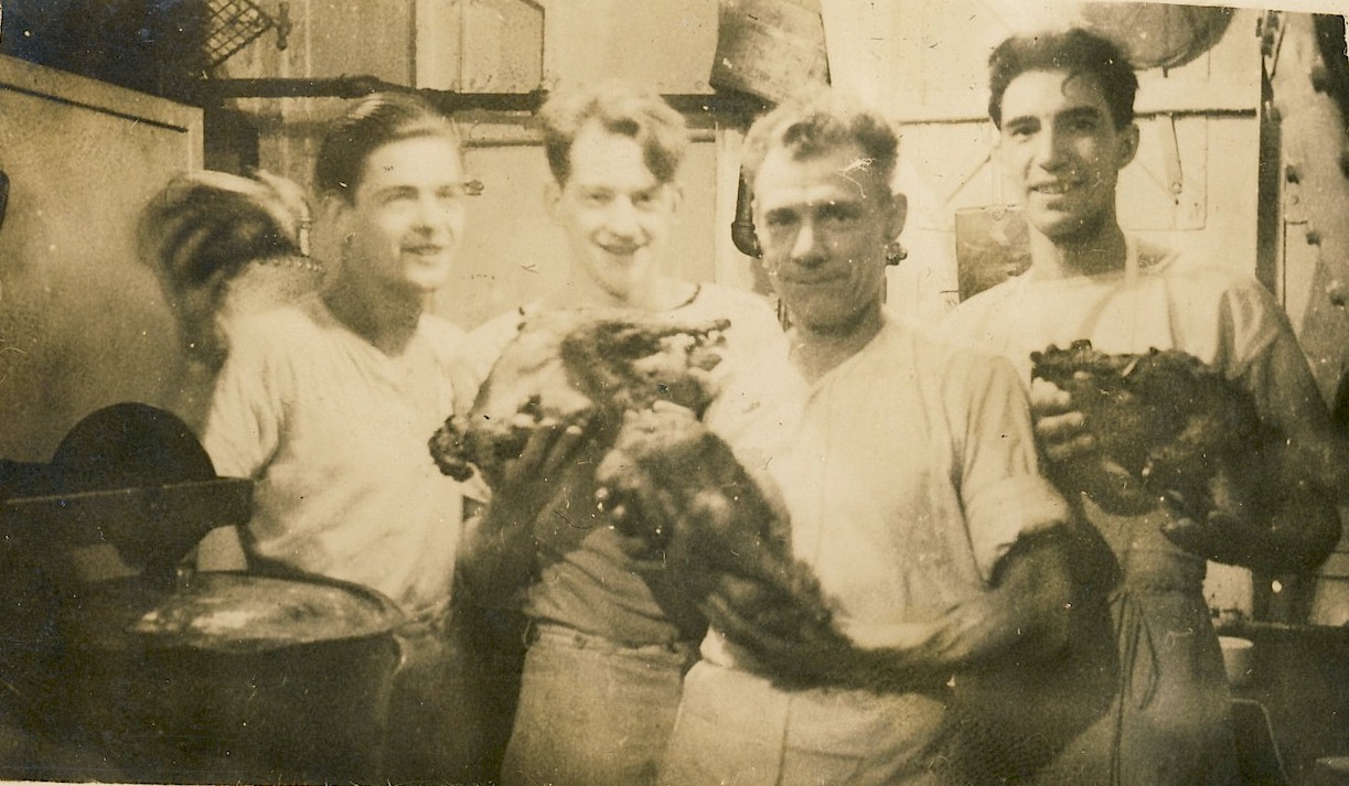 HMCS RESTIGOUCHE, Christmas 1942, Belfast, Ireland (OM02) LCdr Desmond Piers, CO (right) (OM03) The ship's cooks with Christmas dinner. Cook Joseph (Pop) Brousseau in front.