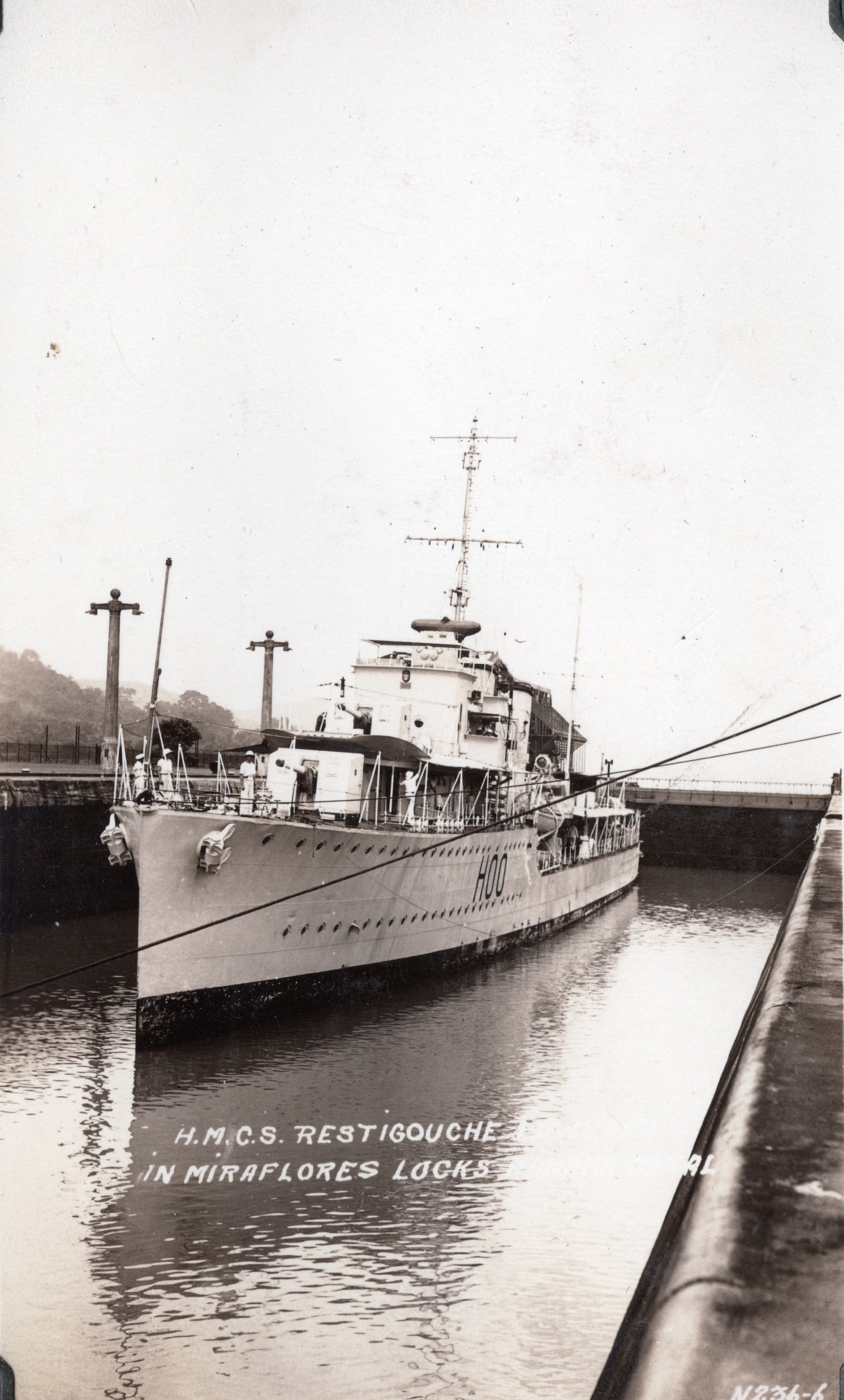 (RGH001) HMCS RESTIGOUCHE H00 with HMCS Ottawa H60 ahead, in the lower chamber, Miraflores Locks, Panama Canal, 18 Apr 1938 // Courtesy of the CFB Esquimalt Naval and Military Museum Photo # 2002.31.8 (RGH002) HMCS RESTIGOUCHE H00 in the lower chamber, Miraflores Locks, Panama Canal, 18 Apr 1938 // From the collection of Robert Webster, PO, RCNVR (RGH003) Unidentified naval ratings painting the destroyer HMCS RESTIGOUCHE, Halifax, Nova Scotia, Canada, October 1940 // Source: Canada. Dept. of National Defence / Library and Archives Canada / PA-104265 // Note: The sailor on the left has been identified as Cecil E. Reeves. (RGH004) HMCS RESTIGOUCHE H00 at Plymouth, 1940 (RGH005) HMCS RESTIGOUCHE H00 at Malta