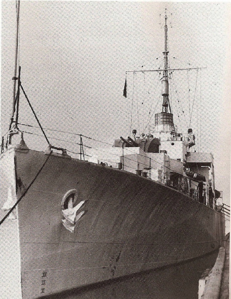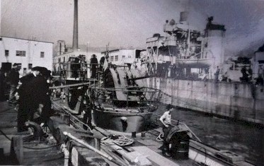 (JH01) HMCS RUNNYMEDE K678 in the slips at Bay Bulls, Nfld (JH02) Looking up at the bow of HMCS RUNNYMEDE K678 while she is in the slips at Bay Bulls, Nfld (JH03) Dockyard at Bay Bulls, Nfld - seen from HMCS RUNNYMEDE K678 (JH04) Three unknown sailors off HMCS RUNNYMEDE K678 (JH05) Anti-Aircraft gun mount on HMCS RUNNYMEDE K678