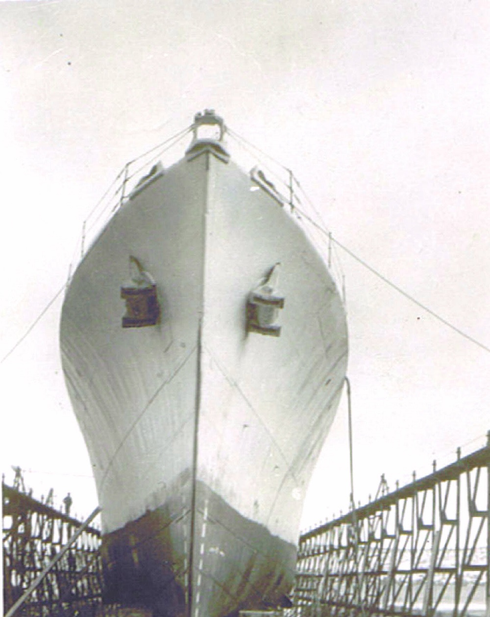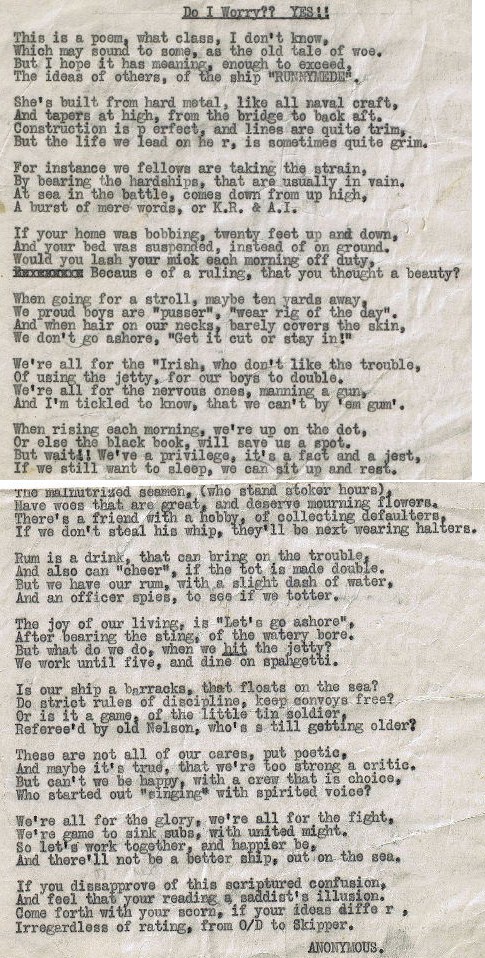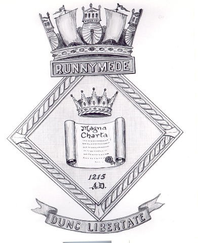 (JM29) HMCS RUNNYMEDE K678 ship's badge. The following is an excerpt from the book "Designs of Distinction" by David Freeman: "RUNNYMEDE was the name used to honour the township of York, ON. King John signed the Magna Carta on the field at RUNNYMEDE, England in 1215. In his memo to Capt (D), the CO, A/LCdr R.C. Chenowith, RCNVR, O-13420, stated the badge design came "from the official seal of the Urban District of Egham, Surrey . . . wherein Runnymede is located." He noted the township had no insignia and had suggest the use of the above design instead. Where the ship employed this insignia is not known." (JM30) HMCS RUNNYMEDE K678 jacket patch (JM31) The Launching of RUNNYMEDE at the Canadian Vickers Ltd Shipyard, Montreal, QC on 27 Nov 1943 (JM32) HMCS RUNNYMEDE in Montreal prior to her commissioning in Jun 1944 (JM33) "Do I Worry?? Yes!! - Poem about HMCS RUNNYMEDE K678