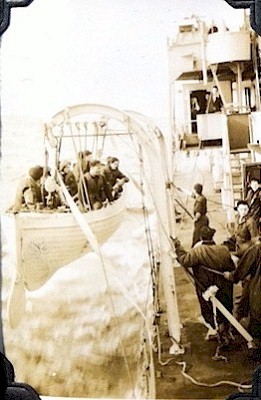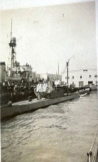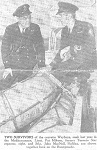 Individual photos from the above Toronto Daily Star headline article (JM37) Shipwright B. Pattier check the ship's lifeboats (JM38) Two survivors of HMCS WEYBURN, sunk in the Mediterranean, LT Pat Milsom, former Toronto Star reporter (right) and Stoker John MacNeil of Halifax on HMCS RUNNYMEDE (JM39) CPO Charlie Lane is shown checking the Sperry gyro compass (JM40) Leading Cook J. C. Peerzan of Halifax carries a pair of lime jugs used for storing water (JM41) One of the officers Lt Don Taylor of Arlington Ave., Toronto. He went RUNNYMEDE collegiate, things that's a sign of good luck