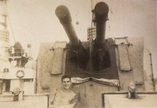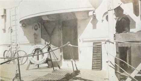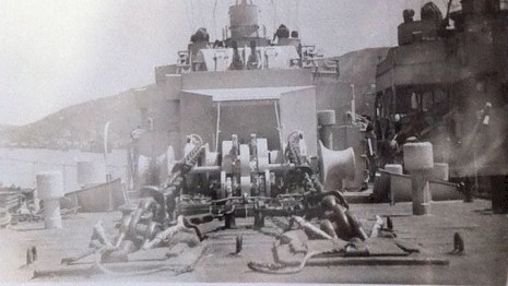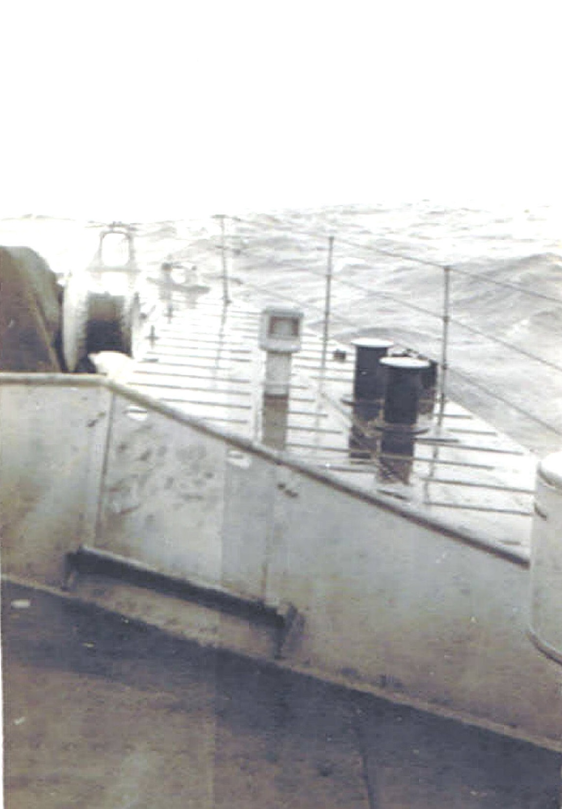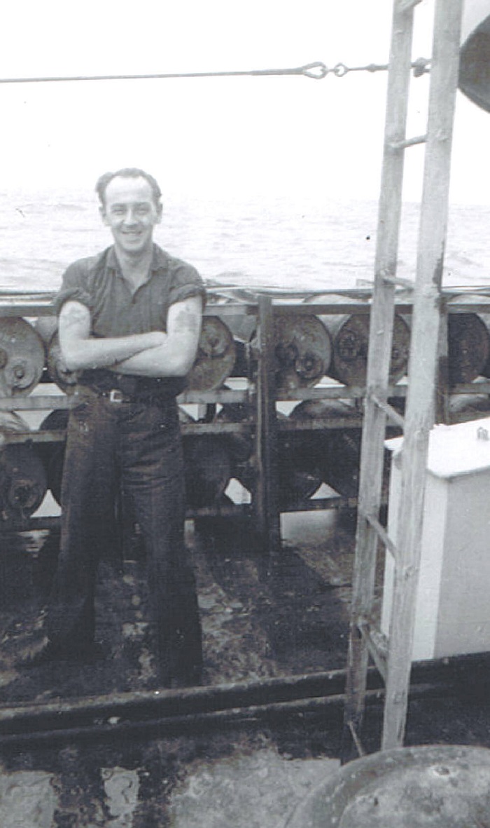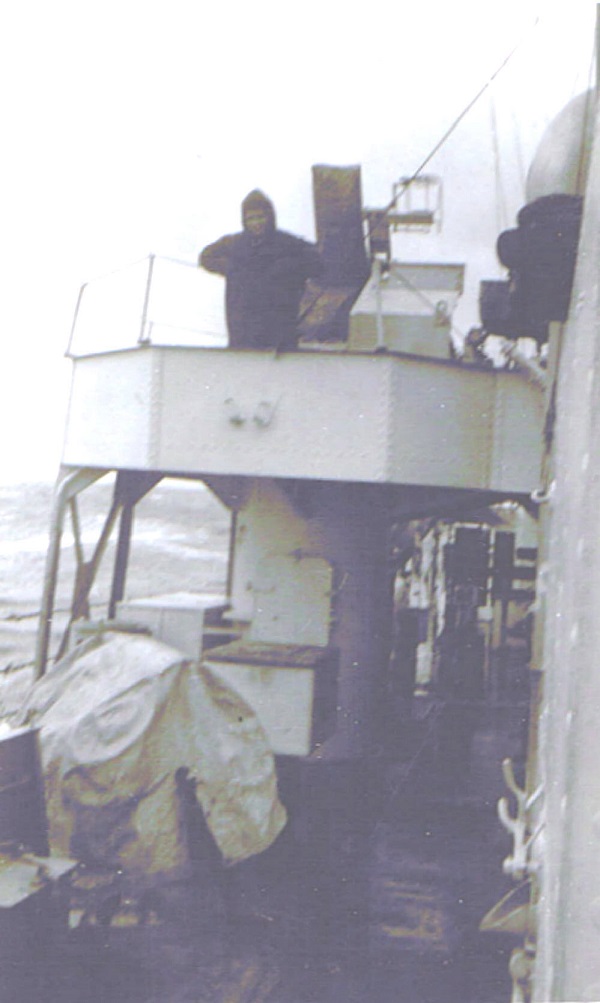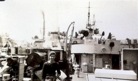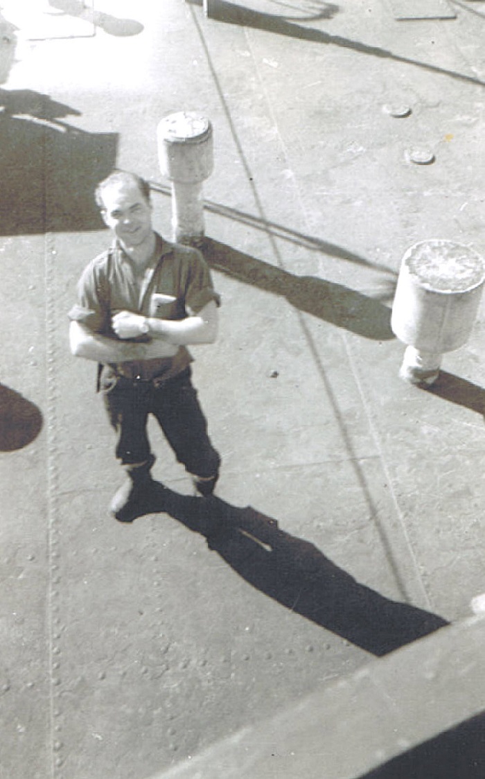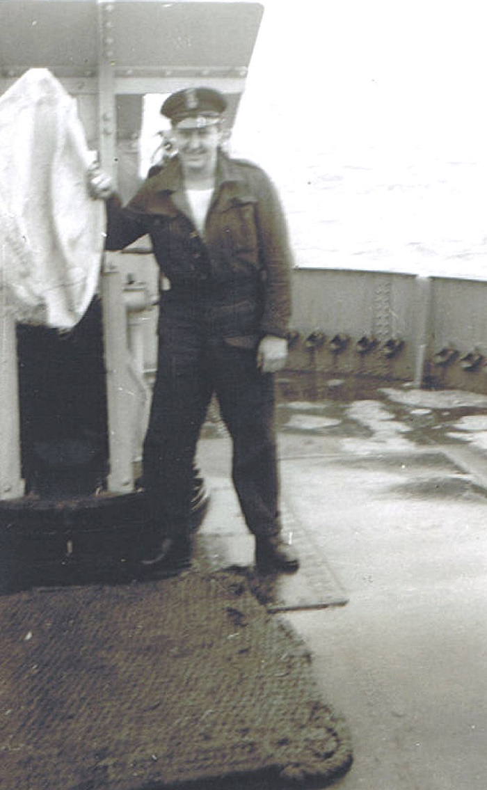 (JM106) John Murphy on the quarterdeck of HMCS RUNNYMEDE K678 by the ladder heading up to the after gun mount
