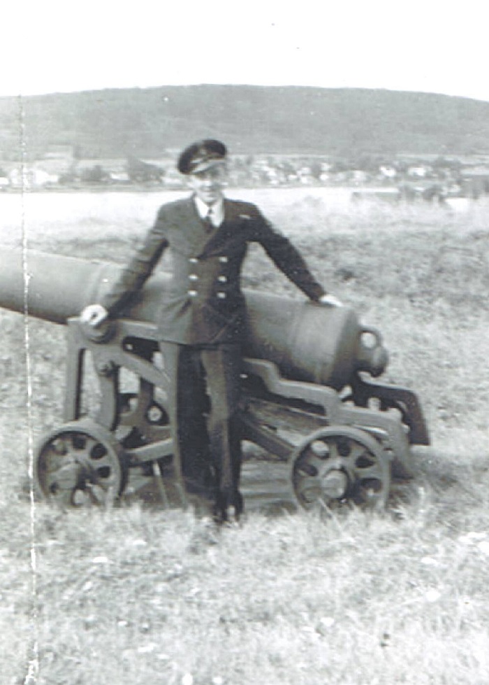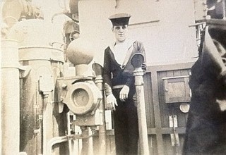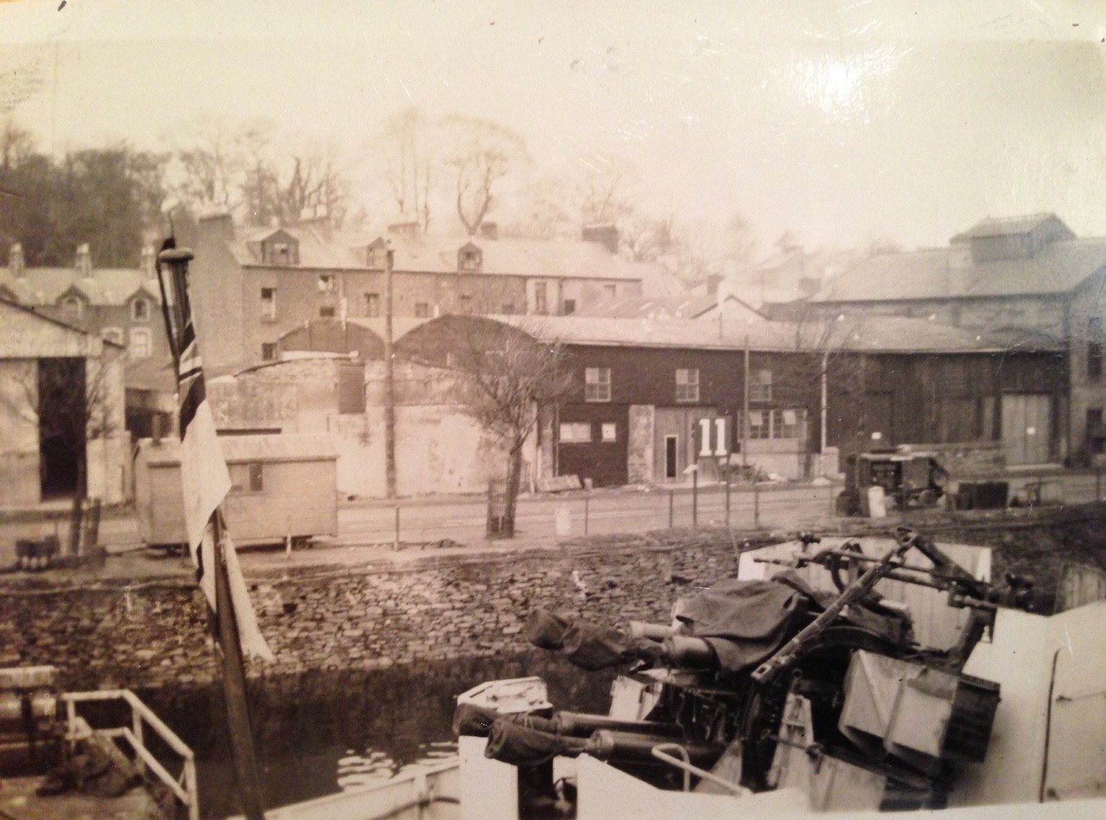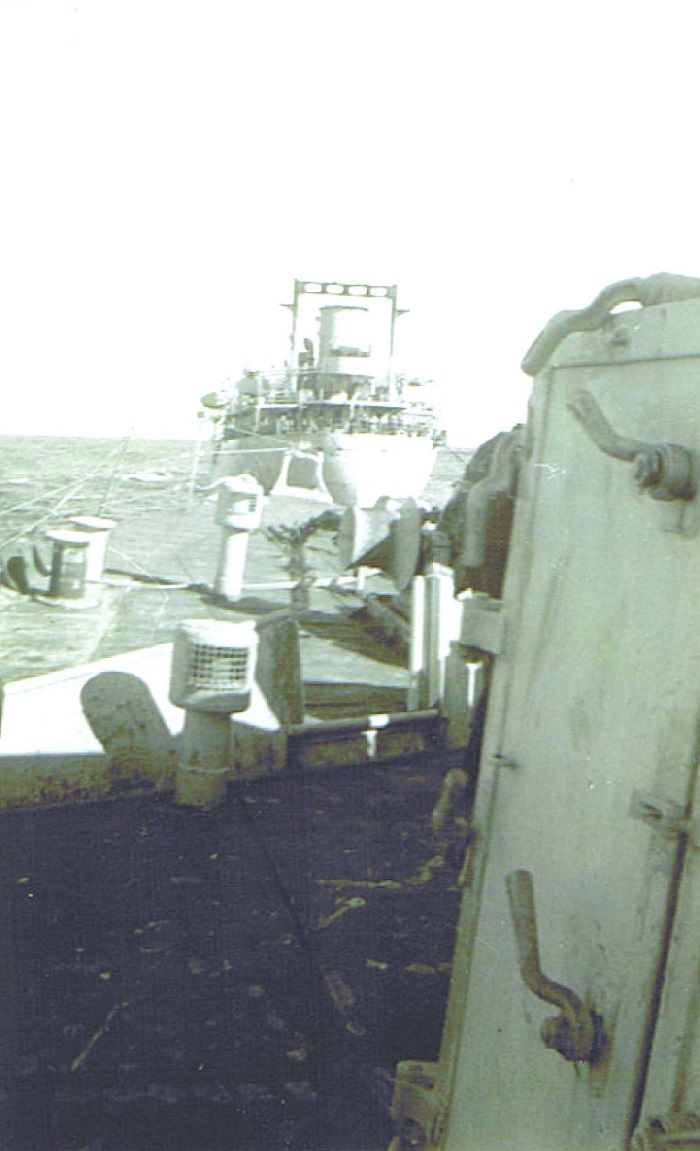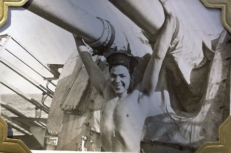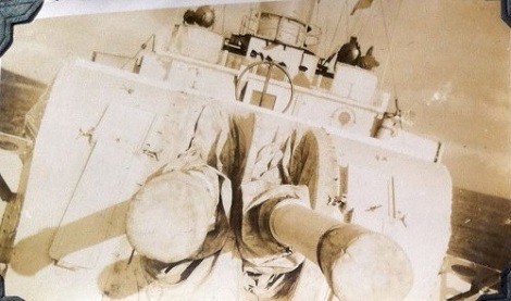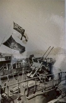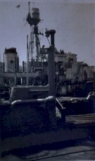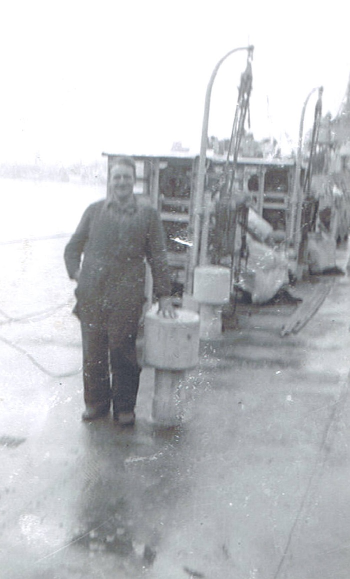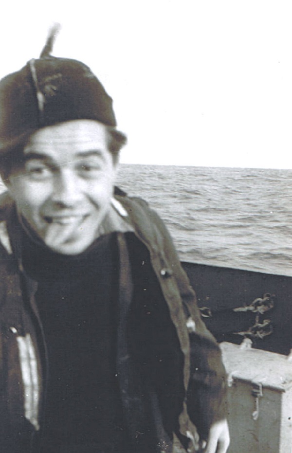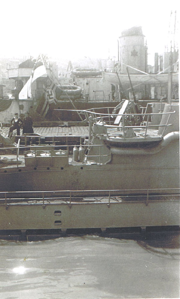 (JM106) John Murphy on the quarterdeck of HMCS RUNNYMEDE K678 by the ladder heading up to the after gun mount