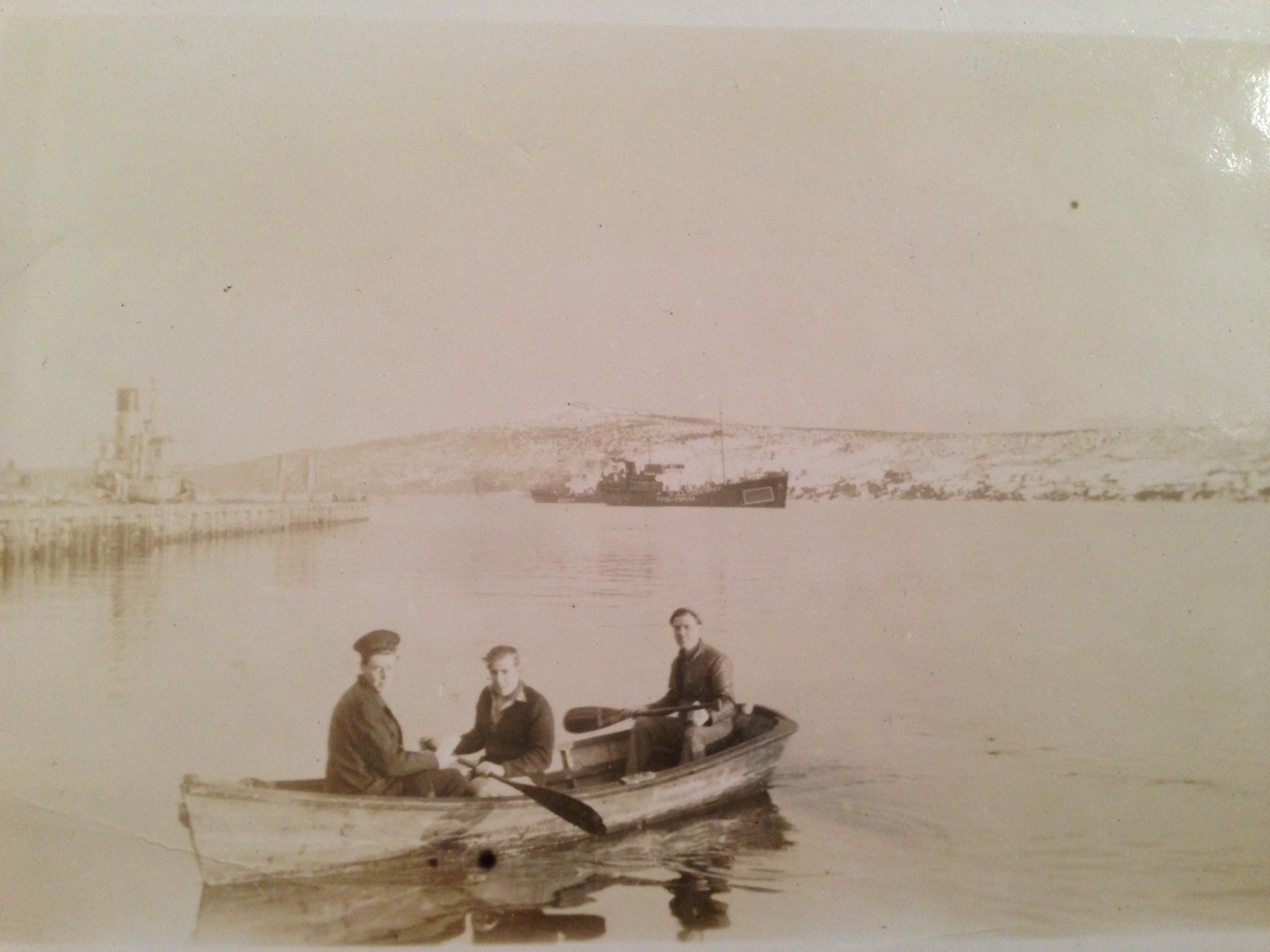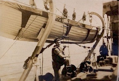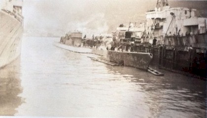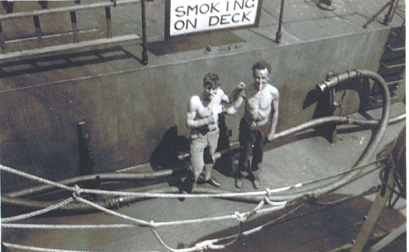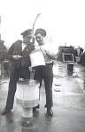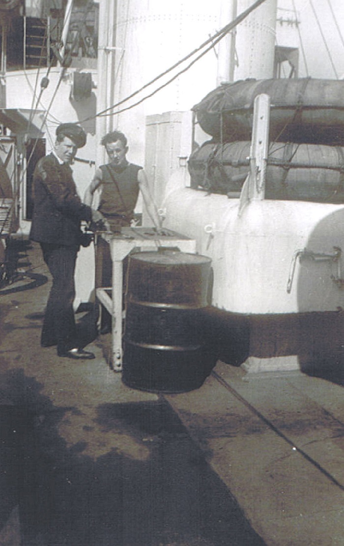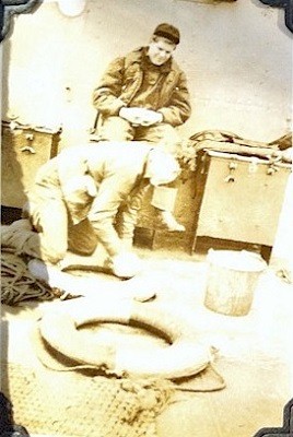 (JM80) Bert Hazelwood and Curley Doyle on a barge alongside HMCS RUNNYMEDE K678 (JM81) Dusty Miller on HMCS RUNNYMEDE K678 (JM82) Unknown sailor in the port gun tub on HMCS RUNNYMEDE K678 (JM83) John Murphy (left) and Merill Sheffield on HMCS RUNNYMEDE K678 (JM84) Unknown sailor on the quarterdeck of HMCS RUNNYMEDE K678