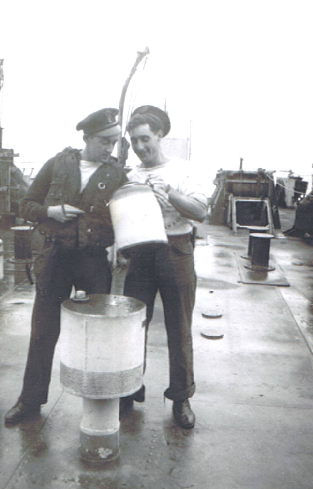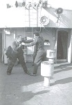 (KW11) Rocket launcher on HMCS RUNNYMEDE K678 (KW12) Ted and Scotty on the bridge of HMCS RUNNYMEDE K678 (KW13) White Watch - Harvey?, Taylor, McDowell, Danny?, Costello, Noolivin, Boyce, Mike, Bobbet (KW14) Sprague and Milhoff on HMCS RUNNYMEDE K678 (KW15) Boyce on HMCS RUNNYMEDE K678