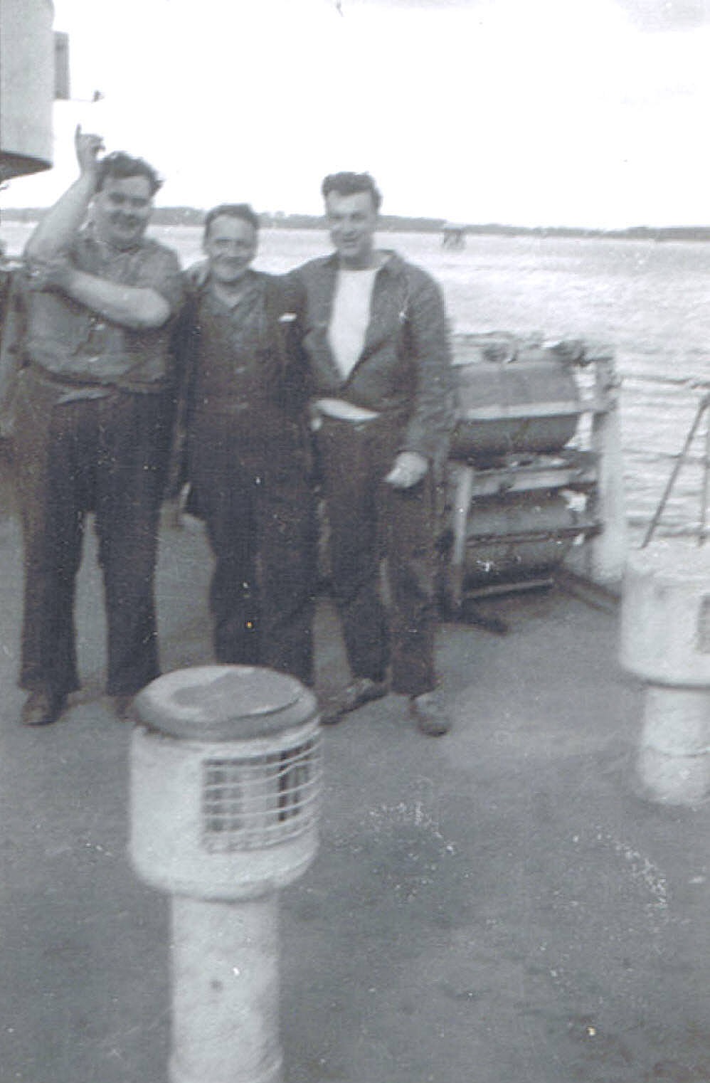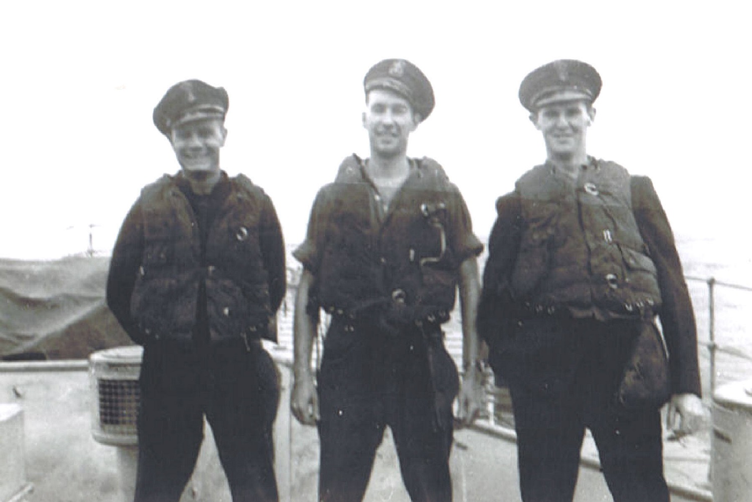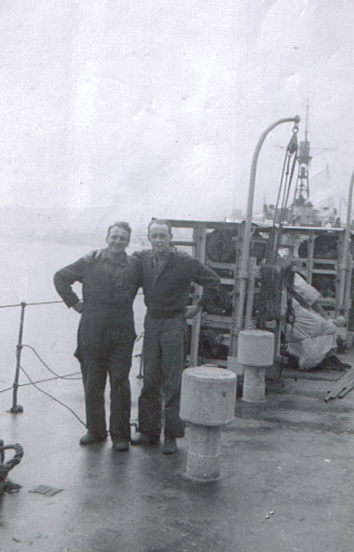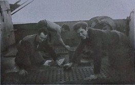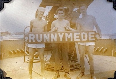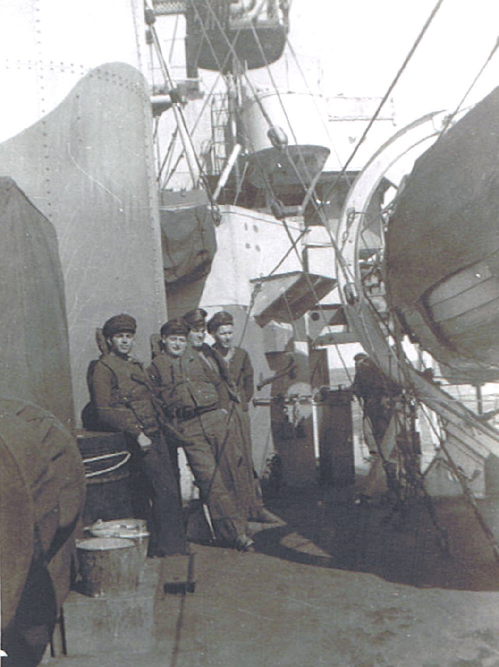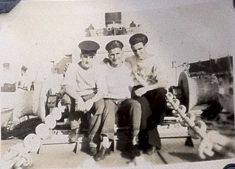 (JM85) John Murphy and Al Cormack on the fo'c's'le of HMCS RUNNYMEDE K678 (JM86) L-R: Johnny Cummins, Al Cormack and Norm Swan on the fo'c's'le of HMCS RUNNYMEDE K678 (JM87) L-R: Bill Duncan, Chips Pottier, Merill Sheffield, Fred Sandever, Doug Park, Ross Gordon and Leo Burns (JM88) L-R: Johnny Kervin, Tiny Faloona, Al Hebert and Herb Robb on the quarterdeck on HMCS RUNNYMEDE K678 (JM89) Standing, L-R; John Murphy, Tiny Faloona, with unknown shipmates on the quarterdeck of HMCS RUNNYMEDE K678