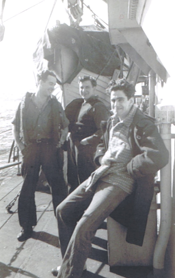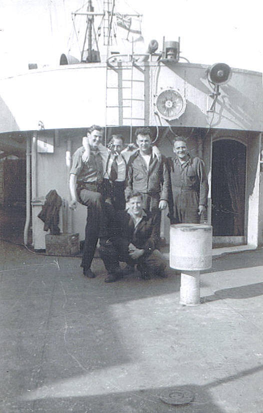 (JM101) Leaning against the bulkhead on HMCS RUNNYMEDE K678 - L-R: Frank Carey, Al Cormack and Dick Hayward. Sailor with his back to the camera unknown (JM102) L-R: Al Cormack, Joe Marshall and Bob Bacon on the boat deck of HMCS RUNNYMEDE K678 (JM103) On the boatdeck, leaning against the funnel on HMCS RUNNYMEDE K678 - L-R: Freddy Orton, Frank Carey, John MacNeil and Bob Vreeland (JM104) Arch Chambers, Royal Navy, by the after gun mount on HMCS RUNNYMEDE K678 (JM105) John Murphy (right) with unknown shipmate on the quarterdeck of HMCS RUNNYMEDE K678