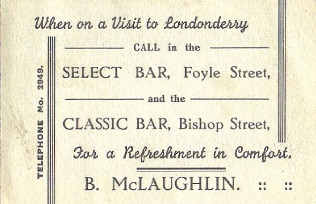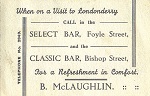 (JM112-JM113) The Foyle River view from Northern Ireland looking towards Ireland (JM114) Postcard of Londonderry, Northern Ireland (JM115) Business card for the "Select Bar" and the "Classic Bar", Londonderry, Northern Ireland (JM116) Bus ticket from Londonderry, Northern Ireland