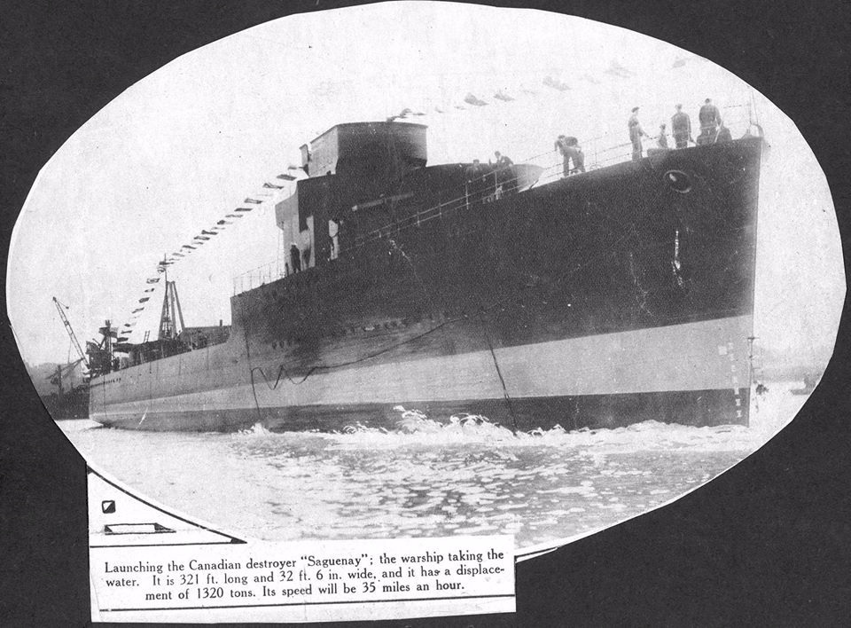SAGUENAY and her sister, SKEENA, were the first ships built for the RCN. SAGUENAY was built by Thornycraft, England for the cost of £670,000. Her hull was strengthened to withstand ice pressure which made her ideal for deployments in Newfoundland waters. She was commissioned on 22 May 1931, at Portsmouth and made her maiden arrival at Halifax on 03 Jul 1931. On 05 Jan 1935, HMCS SKEENA and HMCS VANCOUVER departed Esquimalt for exercises in the Kingston, Jamaica area with HMCS CHAMPLAIN and HMCS SAGUENAY. In Jan 1938, SAGUENAY once again sailed south on a Spring Cruise with port visits at in Bermuda; Puerto Culebra, Costa Rica; Talara, Peru; Acapulco, Mexico; and Panama and San Diego, Calif. With the outbreak of the Second World War she escorted local convoys until late Sep 1939, when she was assigned to the America and West Indies Station, and based at Kingston, Jamaica.