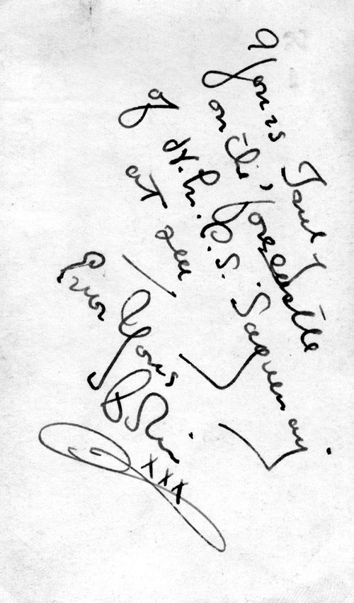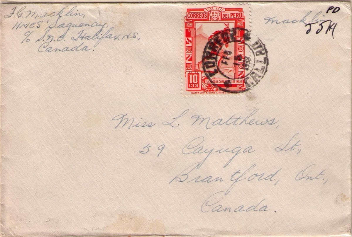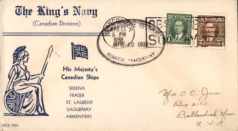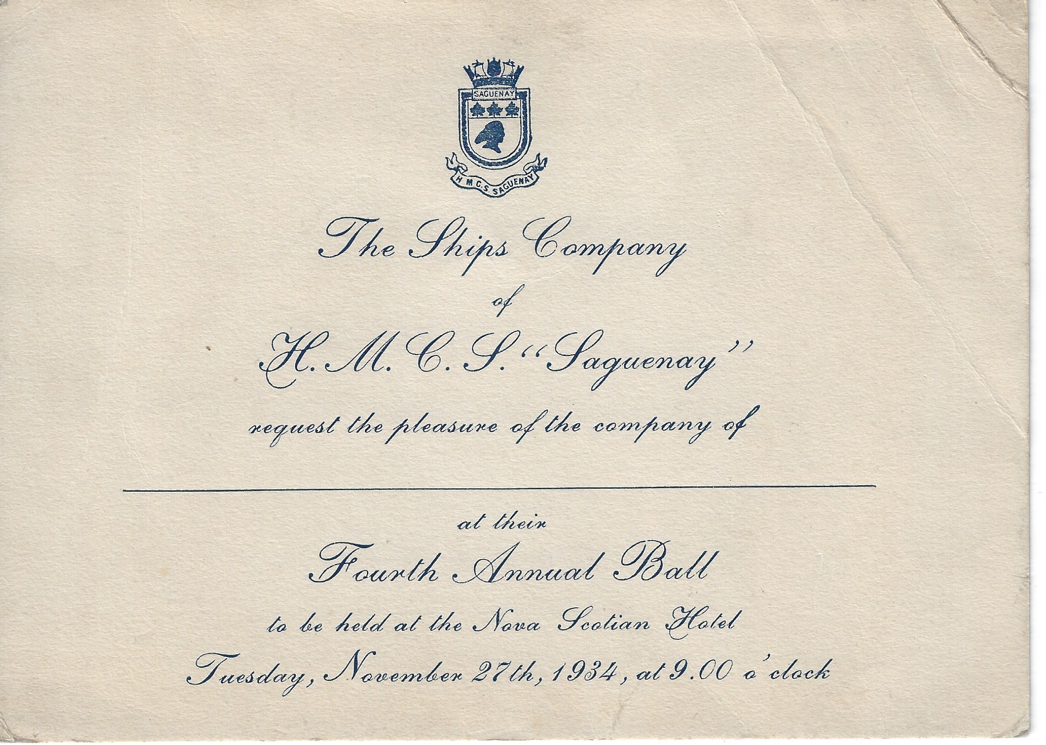 (SAG010) Invitation to the 4th Annual HMCS SAGUENAY Ship's Company Dance at the Nova Scotian Hotel - 27 Nov 1934 // Courtesy of Mike O'Keefe (SAG011) Enveloped addressed to Miss L. Matthews, 59 Cayuga St., Brantford, ON from F.G. Macklin, HMCS SAGUENAY - postmarked 15 Feb 1938 // The following is from the RCN Ledger sheets: Name: Macklin, Francklin George Date of Birth: 1914-01-01 Occupation: Brass Spinner Service Number: 2536 Place of Birth: Brantford, Ontario Religion: United Church Volume: 4 Reference: RG 150 1992-93/170 Item Number: 3485 (SAG012) Post Card with HMCS SAGUENAY ship's stamp dated 12 Apr 1938 (SAG013) LS Johnny Hann and AB Aubrey Redden (right), HMCS SAGUENAY 1938-39 // From the collection of C. Aubrey Redden, CPO1, RCN // Courtesy of Sherri Redden (SAG014) Thomas G. Mosher on HMCS SAGUENAY, date unknown // From the collection of Thomas Mosher // Courtesy of Gordon Rhymes