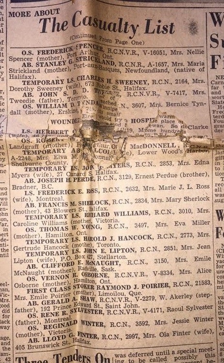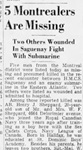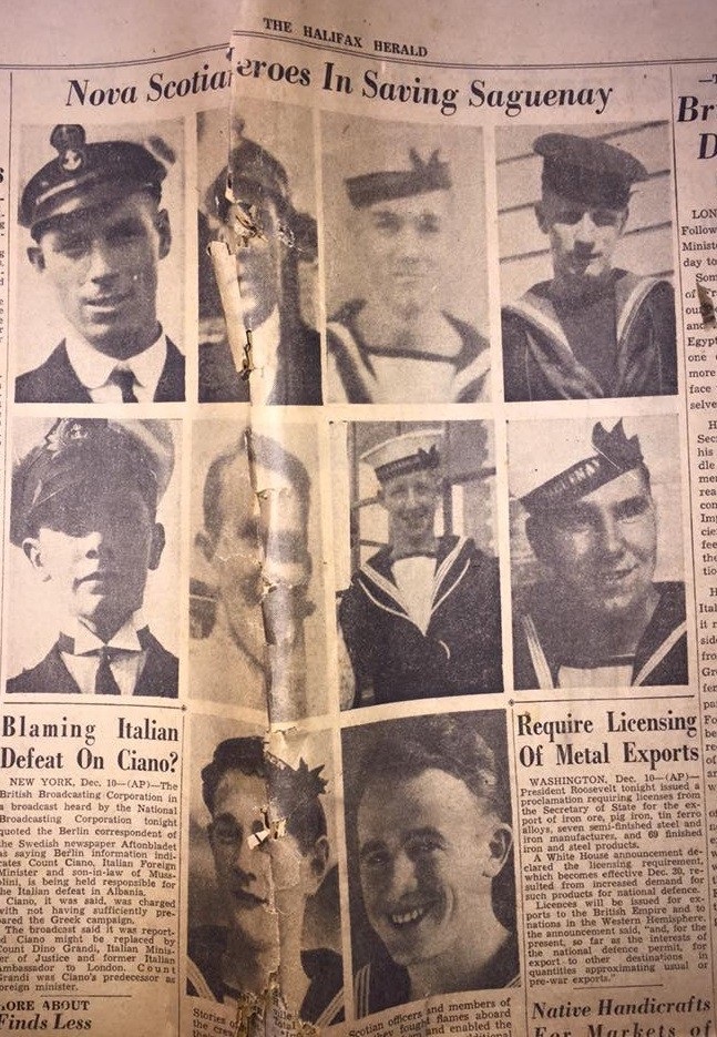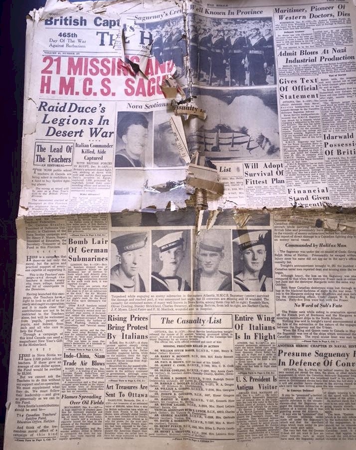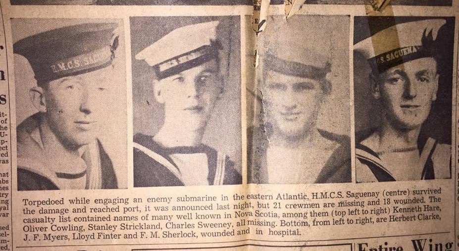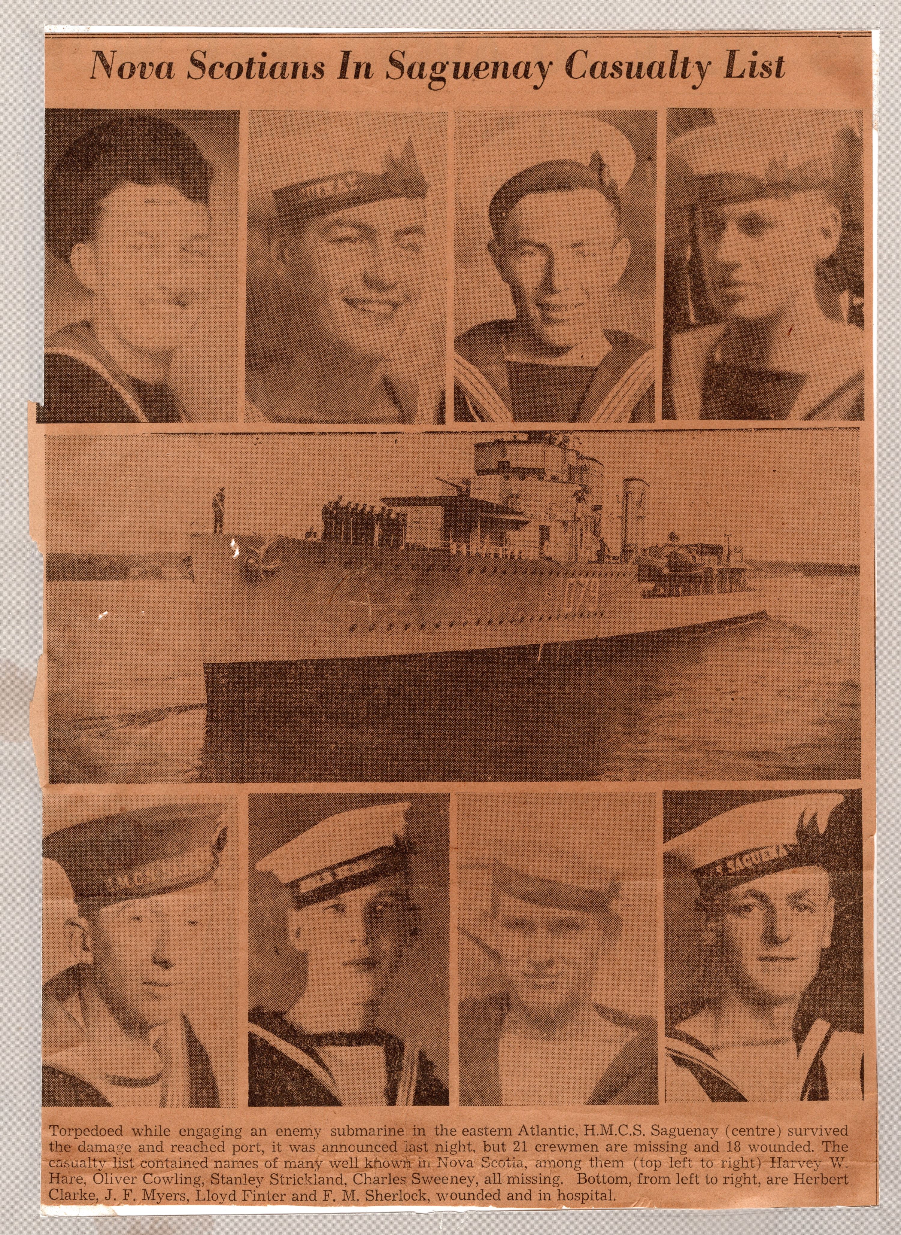 (JC13) Newspaper article on HMCS SAGUENAY - The Halifax Herald (JC14) Nova Scotian sailors who were wounded when HMCS SAGUENAY was torpedoed. Herbert Clarke, J.F. Myers, Lloyd Finter and F.M. Sherlock (JC15) Newspaper article on the torpedoing of HMCS SAGUENAY (JC16) Newspaper article on the torpedoing of HMCS SAGUENAY (JC17) Newspaper article on the torpedoing of HMCS SAGUENAY