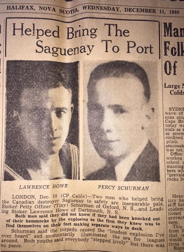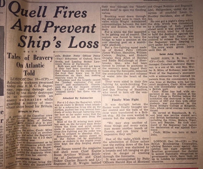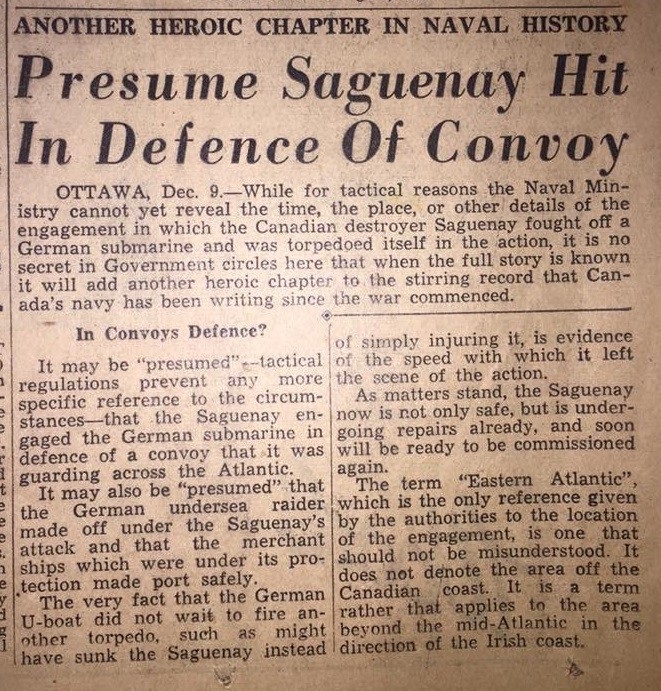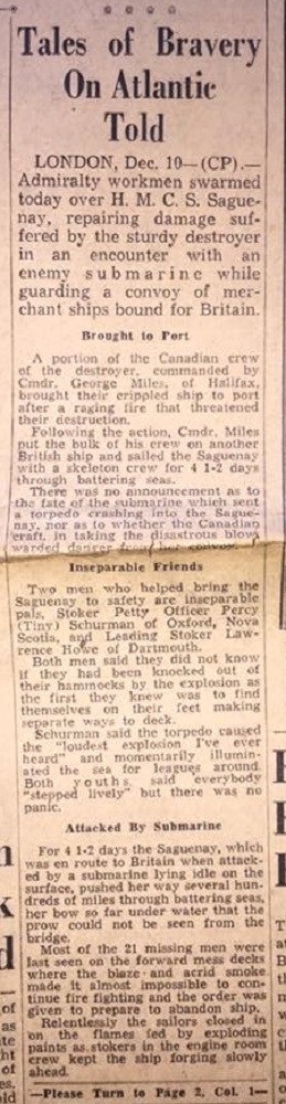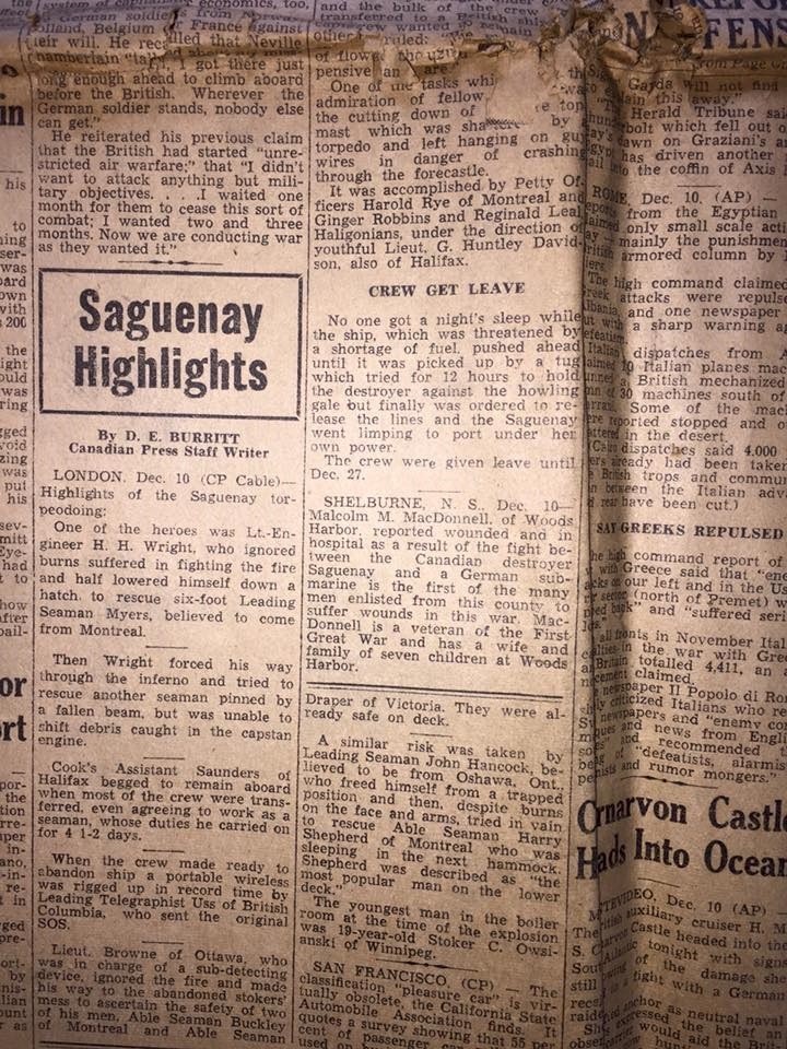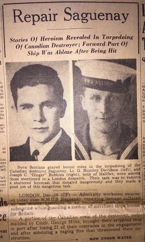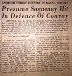 (JC03) Heroism Prevents Loss of Canadian Destroyer - Halifax Star, 11 Dec 1940. Newspaper article on the actions of CERA William Brooking, Chief Stoker Charles Branch and LT Engineer Harold Hutching Wright (JC04) Repair SAGUENAY - Newspaper article on the actions of Lt. G. Huntley Davidson and Joseph C. Robbins (JC05) Helped Bring The SAGUENAY To Port - Newspaper article on L/Sto Lawrence How and Sto PO Percy Schurman (JC06) Newspaper article on the torpedoing of HMCS SAGUENAY (JC07) Newspaper article on the torpedoing of HMCS SAGUENAY