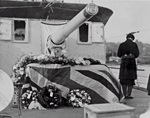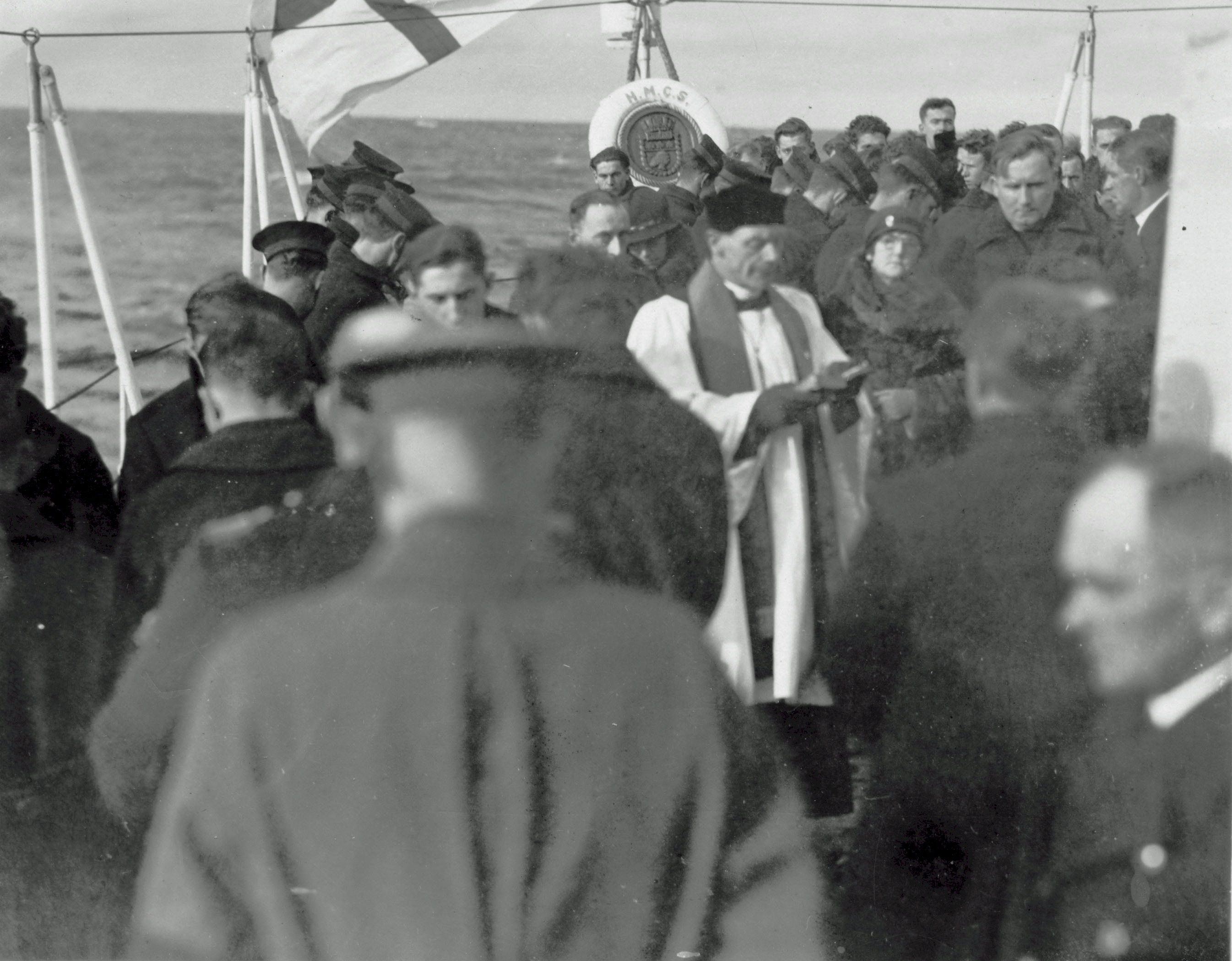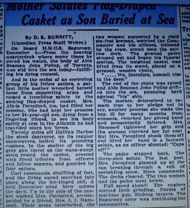 (SAG003-SAG004) Casket with the body of AB John Pulley with guard by the stern gun of HMCS SAGUENAY D79 (SAG005) Engines stopped - lower the ship's ensign - committal party assembled on lee side of quarter deck - committal service commences (SAG006) The body of AB John Pulley is readied for committal to the deep (SAG007) Casket sliding from "committal board" to sea from under ship's ensign. "Caps off" by crew. " Lord God, by the power of your Word you stilled the chaos of the primeval seas, you made the raging waters of the Flood subside, and you calmed the storm on the Sea of Galilee. As we commit the earthly remains of our brother John Pulley to the deep, grant him peace and tranquility until that day when John and all who believe in you will be raised to the glory of new life promised in the waters of baptism. We ask this through Christ our Lord. Amen" (SAG008) A wreath is laid on the ocean grave of AB John Pulley (SAG009) Newspaper article on the burial at sea of AB John Pulley from the Montreal Gazette, 05 Dec 1933 From the collections of Herbert Edward Dowling, RCN & James A. Senior, RCN Courtesy of Bill Cummins and Bob Senior