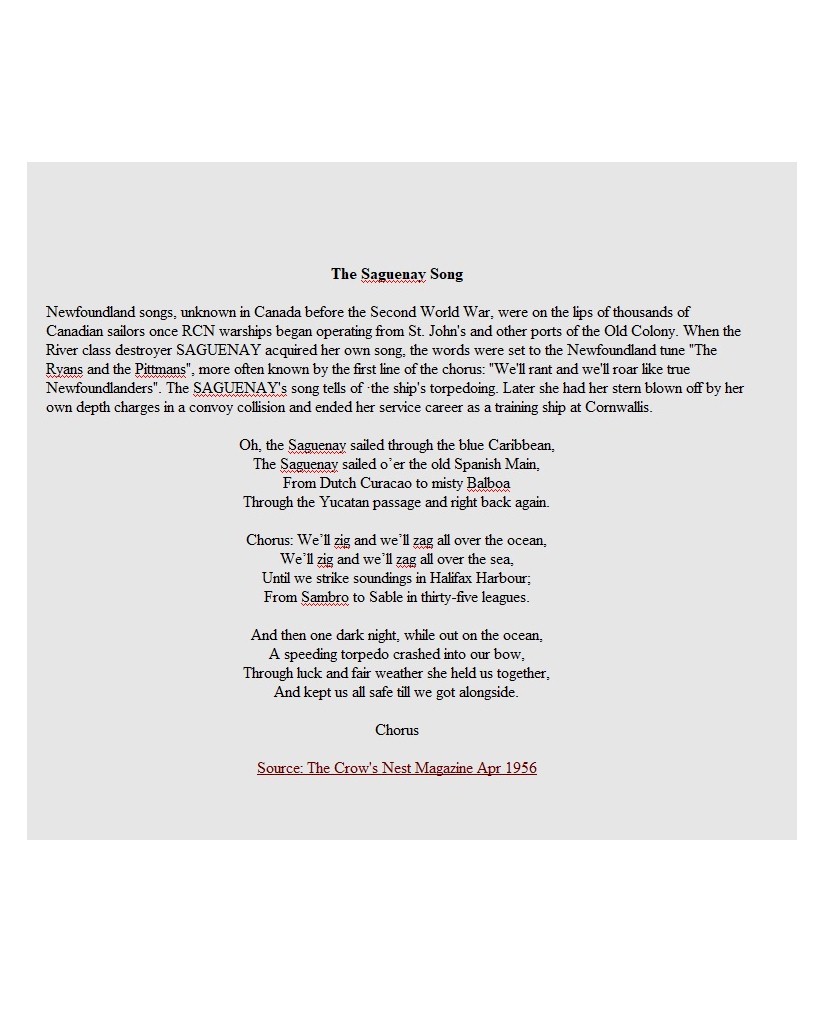 (SAG020) The Saguenay Song // Source: The Crow's Nest Magazine Apr 1956 (SAG021) A song about HMCS SAGUENAY losing her bow to a torpedo // From the collection of Charles Branch, RCN // Webmaster's Note: This song has a few historical inaccuracies as it was an Italian submarine that torpedoed HMCS SAGUENAY, not a German U-boat and they were 300 miles west of Ireland) not 600. However, it was wartime and the write when by either what he believed to be true or by what made the words flow a little smoother. We shall not drop him in the rattle for his transgressions.