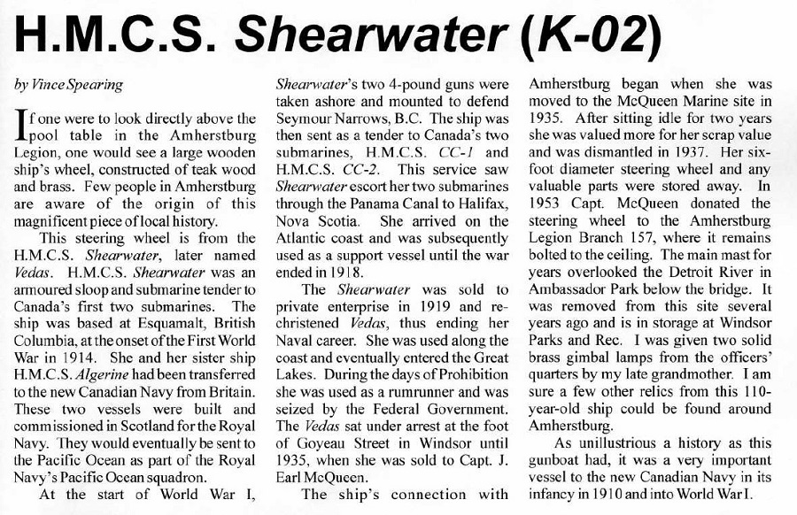Canadian Navy in September 1914. Soon afterwards, many of SHEARWATER's crew were sent to HMCS Niobe in Halifax, which was