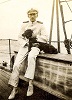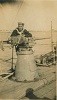 against one of the ship's guns, with the barrel seen on the right. This is one of several photographs from
