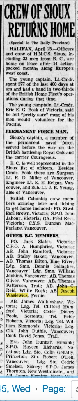 (SIU002) Sioux's Crew Returns Home // Newspaper article from a Nova Scotian newspaper on sailors on HMCS Sioux from Nova Scotia on her return to Canada - Apr 1945 // Sailors listed in the article: PO Stwd Earl C. Brown. M.I.D. (of Halifax); PO Stwd Curtis Johnson (of Middleton); Shpwt Leo Seguss (of Halifax); CPO George Vander Haegen (of Halifax); Sto Alfred Nickerson (of Halifax); Sig Thomas Casson (of Halifax); Ck Stewart Dodsworthy (of Hants Co.); LSA Paul Wilson (of Digby); ERA Edward Ross (of Sydney); PO David Andrews (of Windsor); AB Cecil Richardson (of Shelburne Co.); Lieut H.E. Lawrence, D.S.C.; LCdr Boak, CO; and, LCdr Douglas Burce, XO // From the collection of A/L/Sto Cedric O. Smelser (SIU003) Picton Sailor Sees Action // Newspaper article on AB Fred Walden of Picton and LCdr Doug Bruce of Toronto serving in HMCS SIOUX during Murmansk convoy // Picton Gazette 04 Apr 1945 // Source: Prince Edward County Archives Microfilm collection // Researched and complied by: © John Lyons 2018 (SIU004) William Brown on the fo'c's'le of HMCS SIOUX R64. The ships of a Murmansk Run convoy to Russia in the background // Photo was taken in Vienga Bay, Russia in 1944 // From the collection of William Brown // Courtesy of James Brown (SIU005) Crew of Sioux Returns Home (partial article) // The Province 25 Apr 1945 // Article provides a list of crew members from BC